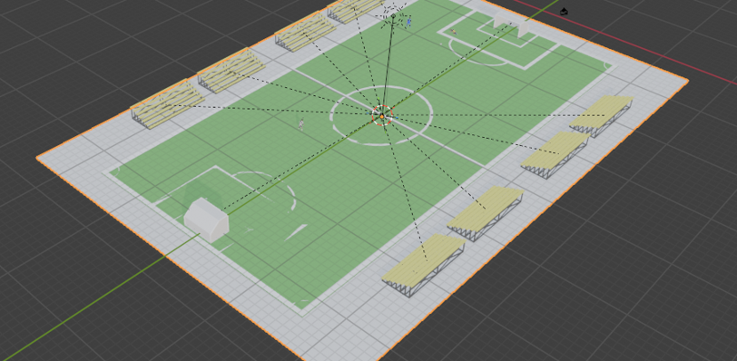 Para iluminar el estadio, añadimos una luz direccional presionando Shift + A > Light > Sun. Con la tecla G elevamos este elemento hacia la parte superior central de la escena. Usando la tecla R, rotamos la línea de dirección de la luz para que los rayos apunten hacia el centro de la cancha.