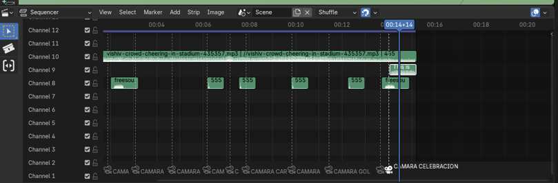 Para el sonido, se seleccionaron varios efectos de sonido traídos de Pixabay y Freesound, así como uno más de YouTube, luego de esto, en blender vamos a la línea de tiempo y cambiamos de ícono a video sequencer. Ahí la línea de tiempo cambiará y se verá vacía. Luego iremos al menú de arriba y seleccionaremos Add > Sound y buscamos cada archivo y lo vamos arreglando a medida que los segundos y frames cambian, para dejar el sonido acorde a como queremos. Luego de esto podemos guardar el archivo y avanzar hacia el renderizado.