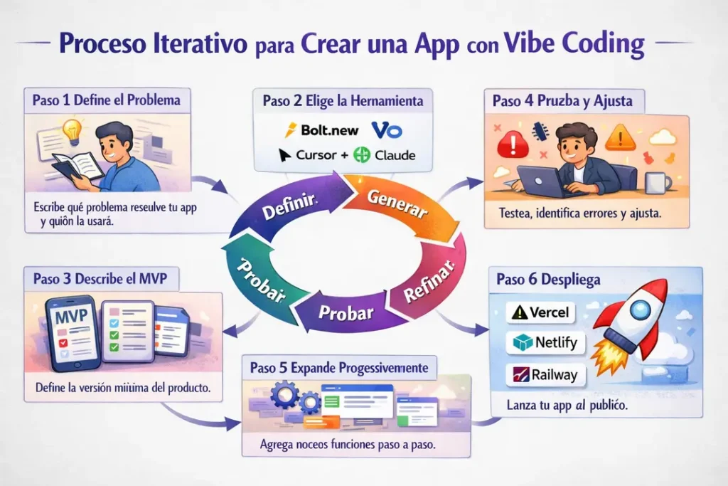 El proceso de crear una aplicación con vibe coding sigue una lógica iterativa. No es lineal: se avanza por ciclos de descripción, generación, prueba y refinamiento.