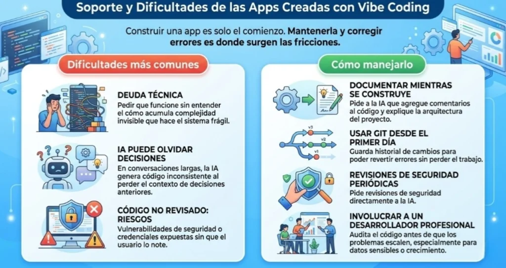 La mejor defensa es documentar mientras se construye: pídele a la IA que agregue comentarios al código y que explique la arquitectura del proyecto. Usa Git desde el primer día para guardar el historial de cambios y poder revertir errores sin perder el trabajo. Pide revisiones de seguridad periódicas directamente a la IA. Y cuando la app maneja datos sensibles o necesita crecer, lo más inteligente es involucrar a un desarrollador que audite el código antes de que los problemas escalen.
