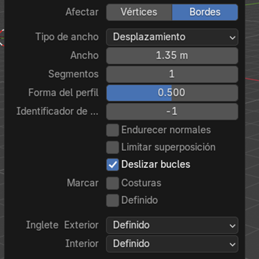 El siguiente paso será presionar la combinación de teclas Ctrl + B para aplicar un biselado a la geometría seleccionada. Al realizar esta acción, en la parte inferior izquierda de la pantalla se desplegarán las opciones del biselado, desde donde podremos ajustar parámetros como la cantidad de segmentos y la forma del bisel, permitiéndonos definir con mayor precisión la estructura inicial de la escalera.