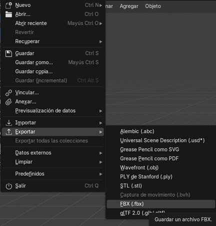 Una vez descargado el avatar, procedemos a importarlo en Blender con el fin de realizar los ajustes necesarios. Posteriormente, exportamos el modelo en formato .fbx, ya que este formato es compatible con la plataforma Mixamo, desde donde podremos aplicar y descargar las animaciones necesarias que serán utilizadas en nuestro personaje dentro del proyecto.
