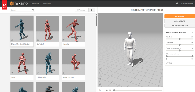Una vez que el modelo ha sido cargado correctamente en Mixamo, procedemos a explorar la biblioteca de animaciones disponible. En esta etapa, seleccionamos las animaciones que mejor se adecuen a las acciones y movimientos que realizará nuestro personaje, y posteriormente las descargamos para poder utilizarlas dentro de Blender en la animación final del proyecto.