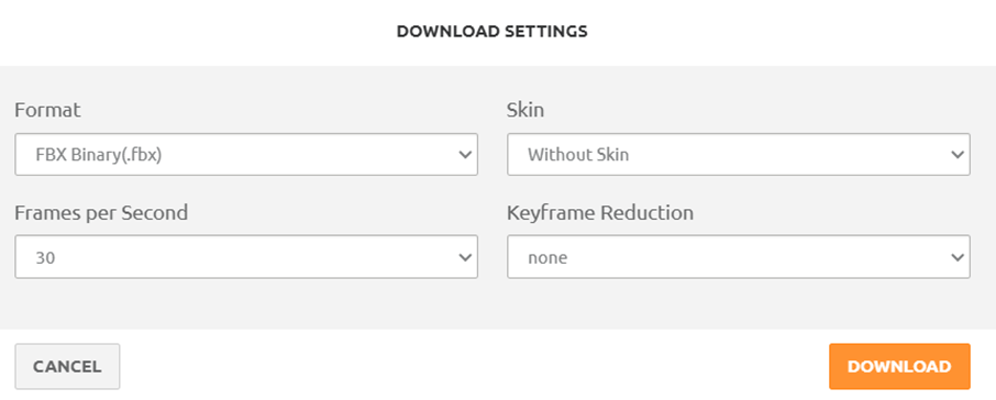 Como se mencionó anteriormente, exportamos el modelo en formato .fbx con el fin de poder cargarlo en la plataforma Mixamo. Este formato es necesario para que el modelo sea reconocido correctamente y nos permita aplicar las animaciones que utilizaremos posteriormente en nuestro personaje.