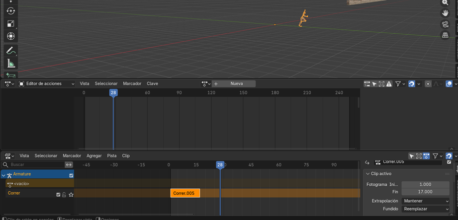 El siguiente paso consiste en unir todas las animaciones con el fin de generar una sola animación continua para nuestro personaje. Abrimos un panel del Editor de Acciones y, de manera paralela, otro panel de Animación No Lineal.