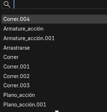 A continuación, seleccionamos cada una de las animaciones importadas y procedemos a renombrarlas de manera adecuada. Este paso es importante para mantener un mejor orden dentro del proyecto y facilitar la identificación de cada animación.
