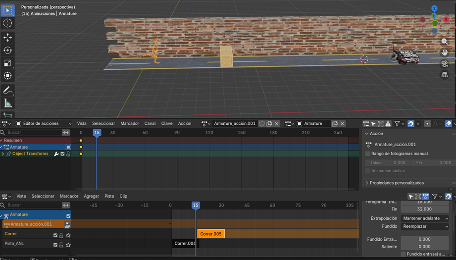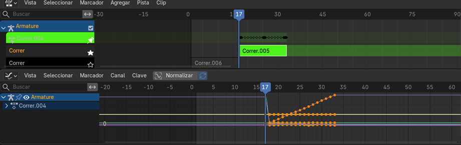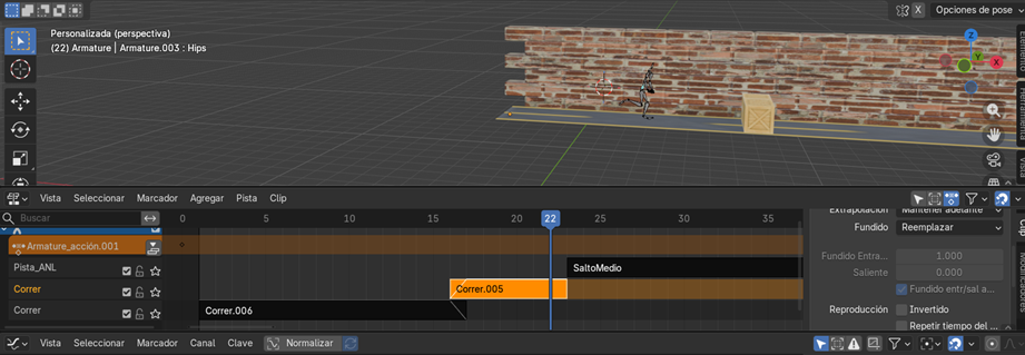 Por último, con el fin de suavizar la transición entre los movimientos, ajustamos los parámetros en la opción Fundido de entrada. Mediante esta configuración, logramos que el cambio entre animaciones sea más fluido y natural, lo cual se puede identificar visualmente por la aparición de una línea en diagonal en la línea de tiempo, indicando una mezcla progresiva entre ambas animaciones.