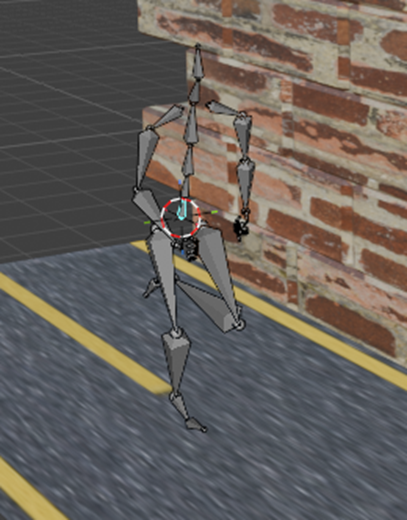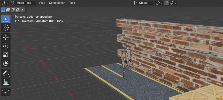 Una vez que contamos con las dos acciones agregadas, procederemos a unirlas para lograr una transición fluida entre los movimientos. Para ello, ingresamos al Modo Pose y seleccionamos el hueso central del esqueleto. Este proceso es esencial en la animación 3D en Blender para lograr transiciones fluidas.