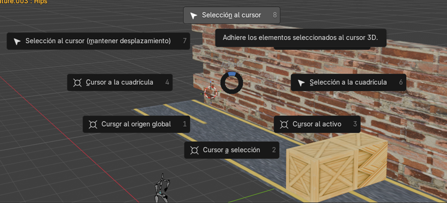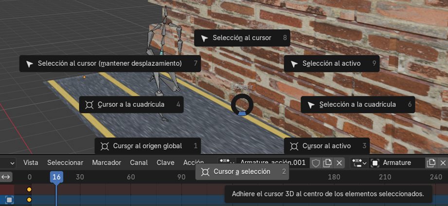 A continuación, pulsamos la combinación de teclas Shift + S y seleccionamos la opción Cursor al seleccionado. Esta acción hará que el punto de origen se ubique exactamente en el hueso central del personaje, permitiendo que la nueva animación se inicie desde esa posición.