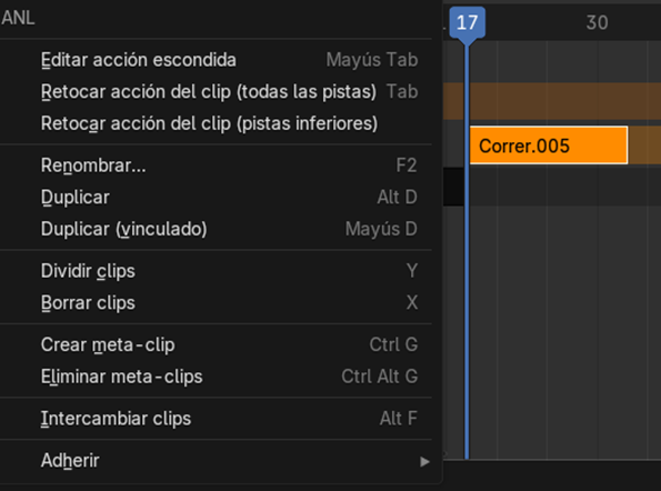 A continuación, procederemos a unir la siguiente animación. Para ello, acercamos la nueva animación dentro del panel de Animación No Lineal (ANL) hasta la animación anterior. Luego, hacemos clic derecho sobre la animación y seleccionamos la opción Editar acción escondida, lo que nos permitirá modificar su posición y realizar los ajustes necesarios para que la transición entre ambas animaciones sea correcta y fluida.