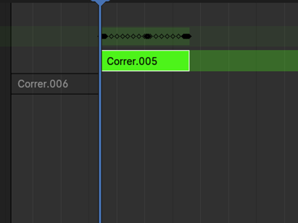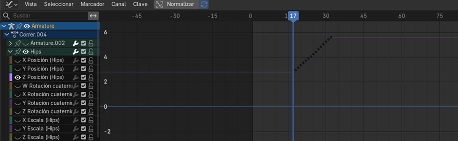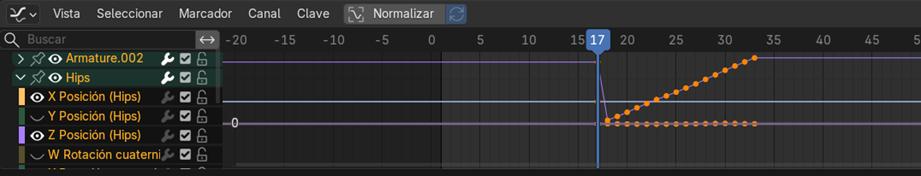 Posteriormente, realizamos el mismo procedimiento en el eje Z. Ajustamos la curva correspondiente seleccionando el primer fotograma de la animación y modificamos su comportamiento para que se mantenga alineado con la nueva posición, garantizando que el desplazamiento del personaje sea uniforme y continuo a lo largo de toda la animación.