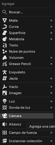 Después de haber agregado y unificado todas las animaciones del personaje, procederemos a crear la animación de la cámara. Para iniciar este proceso, agregamos una cámara a la escena utilizando la combinación de teclas Shift + A, lo cual nos permitirá comenzar a definir los movimientos y encuadres necesarios para mostrar correctamente el recorrido del escenario. La animación 3D en Blender también incluye la gestión de cámaras para mejorar la narrativa visual.