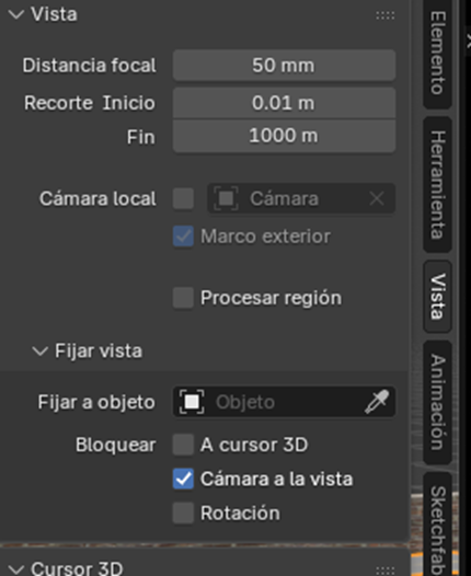Luego de agregar la cámara a la escena, procedemos a configurarla para obtener una mejor movilidad y control durante su animación. Para ello, presionamos la tecla N y seleccionamos la opción Vista, lo cual desplegará distintas funciones de la cámara. En este apartado, activamos la casilla Cámara a la vista, lo que nos permitirá mover y ajustar la cámara con mayor facilidad desde la vista del usuario, facilitando así la definición de los encuadres y movimientos necesarios para la animación.