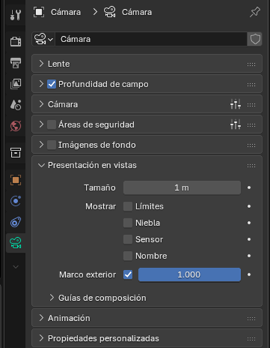 El siguiente paso para continuar con la configuración de la cámara consiste en seleccionarla y dirigirnos al panel de propiedades ubicado en la parte inferior derecha de la pantalla, donde identificaremos un ícono verde con forma de cámara. Dentro de este apartado, buscamos la sección denominada Presentación de vistas y, al ingresar, localizamos la opción Marco exterior. Ajustamos este valor al máximo, lo cual hará que únicamente se visualice lo que capta la cámara, ocultando el resto del entorno y permitiéndonos trabajar con mayor precisión en la animación de los encuadres.