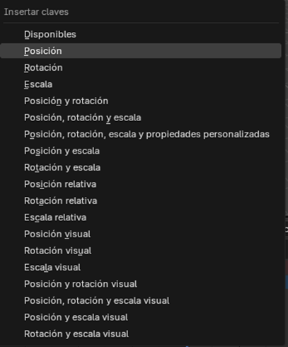 Una vez configurada la cámara, la ubicamos en la primera posición desde la cual deseamos iniciar la animación. A continuación, marcamos un punto clave que funcionará como punto inicial del movimiento de la cámara. Para registrar este punto clave, presionamos la tecla K y seleccionamos la opción Posición, lo cual permitirá guardar la ubicación exacta de la cámara en la línea de tiempo y comenzar con la animación de forma ordenada.