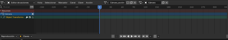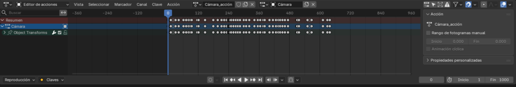 Esto hará que en la línea de tiempo quede registrado el punto clave inicial de la animación. A partir de este momento, repetiremos el mismo procedimiento con los demás puntos clave que sean necesarios, colocando la cámara en distintas posiciones a lo largo del recorrido, con el fin de generar transiciones suaves y continuas que permitan un movimiento fluido y dinámico en la animación de la cámara.