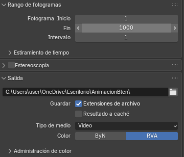 Para finalizar el proyecto, procederemos a renderizar la animación. Para ello, nos dirigimos a la herramienta de Salida, donde configuramos los parámetros del render. En el apartado Tipo de medio, seleccionamos la opción Video, lo que nos permitirá exportar el proyecto final en un formato audiovisual listo para su visualización y entrega.