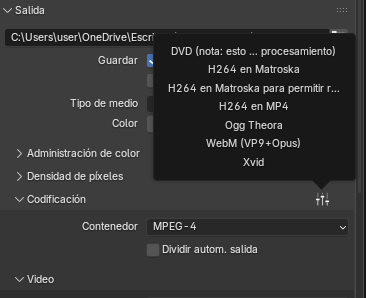 Posteriormente, accedemos a la opción Codificación y seleccionamos el formato H.264, estableciendo como contenedor el formato MP4. Esta configuración nos permitirá obtener un archivo de video con buena calidad y un tamaño adecuado, facilitando su reproducción y distribución una vez finalizado el render del proyecto.