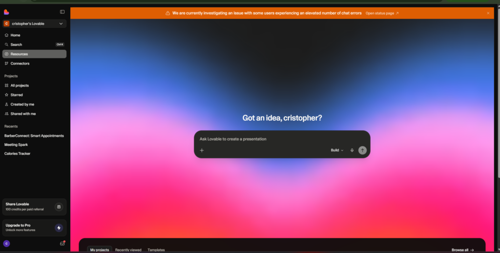Para comenzar, ingresé a lovable.dev y creé una cuenta gratuita. Lovable permite registrarse con correo electrónico o con cuenta de Google/GitHub. Una vez dentro, el dashboard muestra una interfaz limpia con un campo de chat donde se escriben los prompts.