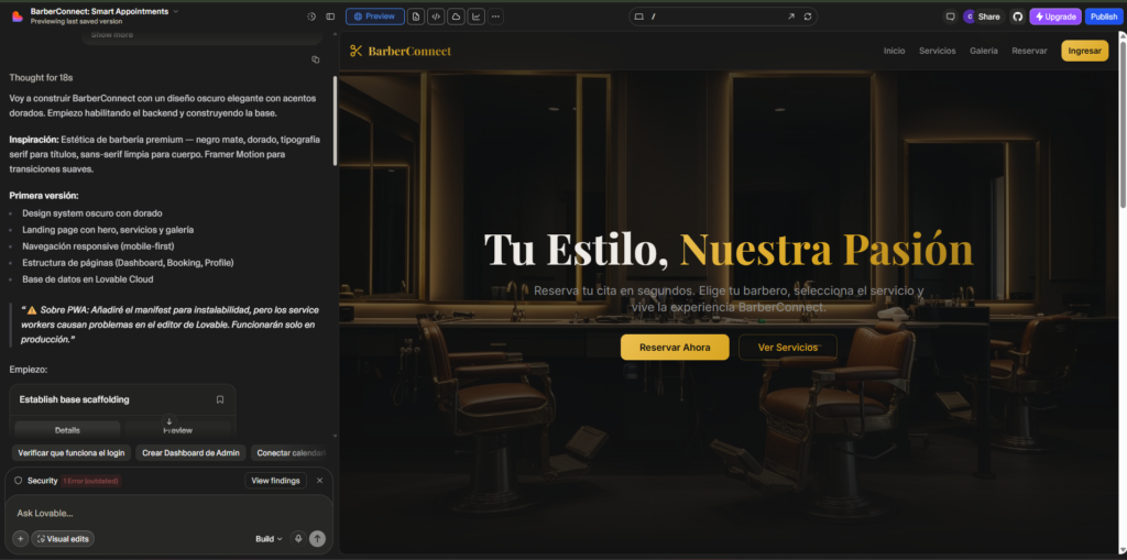 En el chat de Lovable, pegué el prompt principal (detallado en la sección 6 de este artículo). Lovable procesó la instrucción durante aproximadamente 18 segundos, durante los cuales mostró su plan de acción: establecer el sistema de diseño oscuro/dorado, construir la landing page con navegación, crear el esquema de base de datos y montar la estructura de páginas.
