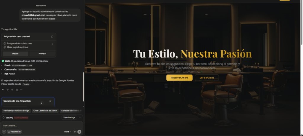 Después de revisar el resultado, solicité a Lovable que creara un usuario administrador funcional con credenciales específicas. El prompt de iteración fue:
