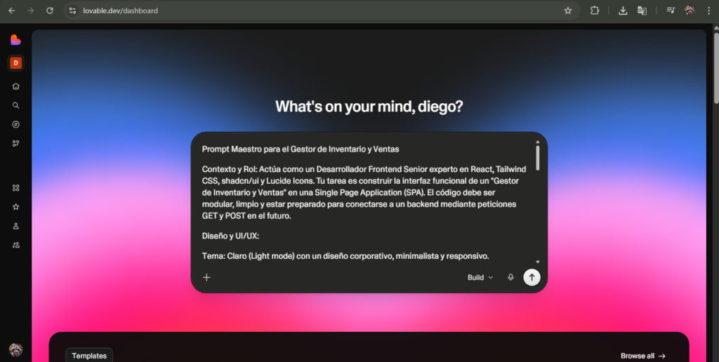3. Inserción del Prompt Arquitectónico: La Magia Comienza Este fue el momento crucial. Introdujimos el “Prompt Maestro” (detallado en la sección anterior), el cual actuó como nuestras especificaciones técnicas exhaustivas. Le indicamos a la IA el rol que debía asumir, la estructura de la aplicación (Single Page Application), el diseño claro y la lógica de estado necesaria para el inventario.