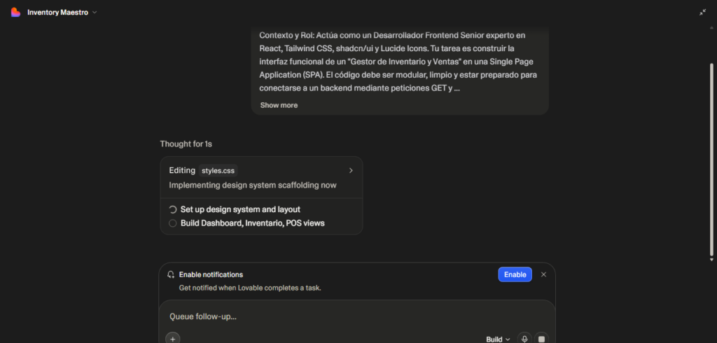 4. Generación en Tiempo Real y Construcción de la Interfaz Tras enviar el prompt, Lovable comenzó a procesar las instrucciones. A la izquierda, la IA analizaba la arquitectura y escribía el código necesario (como los estilos y el layout), mientras a la derecha se preparaba para renderizar la previsualización. Fue la demostración palpable de la inmensa velocidad de prototipado que ofrece esta tecnología.