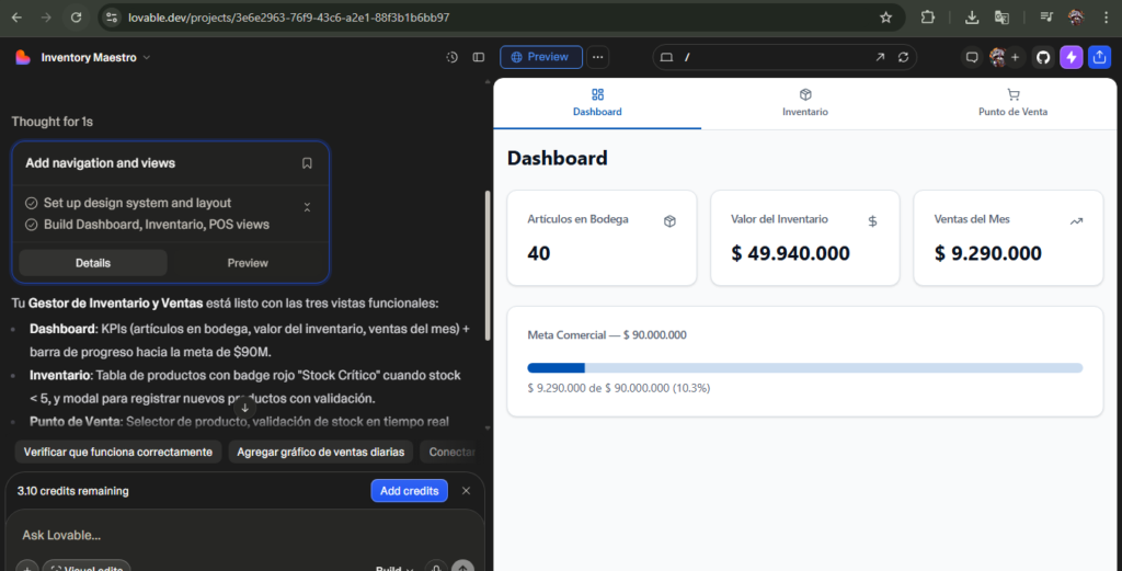 5. Previsualización y Adaptación a la Realidad Comercial En cuestión de segundos, la interfaz cobró vida. La IA estructuró perfectamente el panel de control. Como se observa en el resultado, la herramienta fue personalizada para reflejar la realidad comercial, configurando en el Dashboard una barra de progreso que mide las ventas frente a la meta ajustada de $90.000.000. Este nivel de personalización es vital para mantener un control exacto cuando factores externos de la ciudad, como la congestión por las obras de la Avenida Caracas, obligan a recalibrar las proyecciones y planes de trabajo.