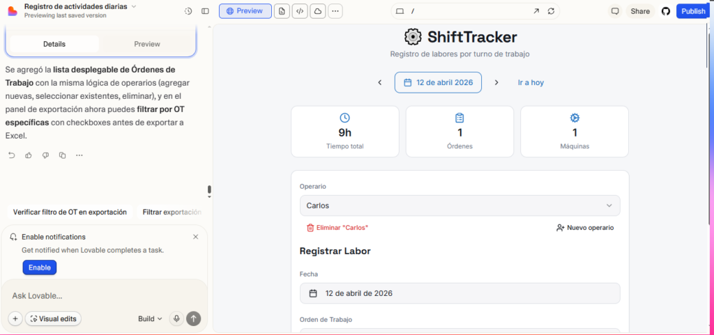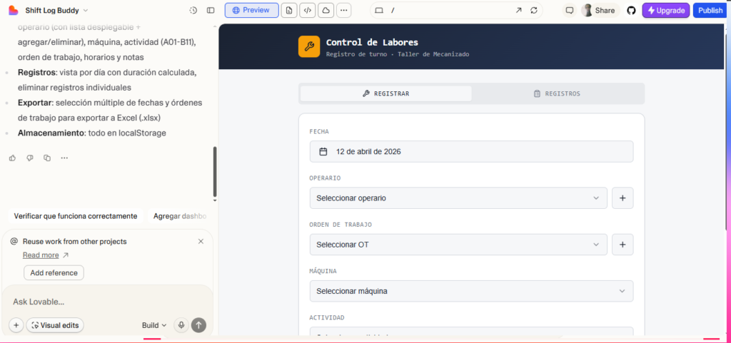 Revisar la app verifica que tenga: operarios, fecha, máquinas, actividades, ordenes de trabajo, registro de tiempo