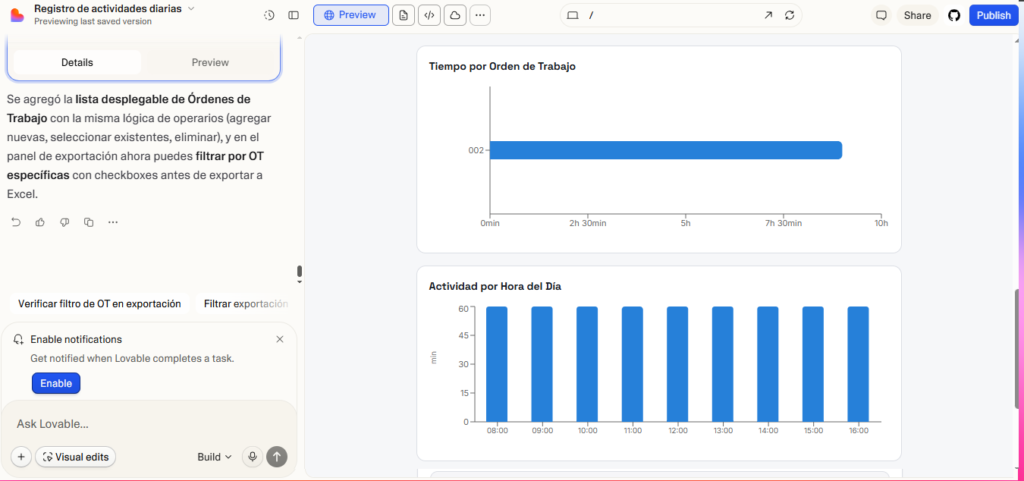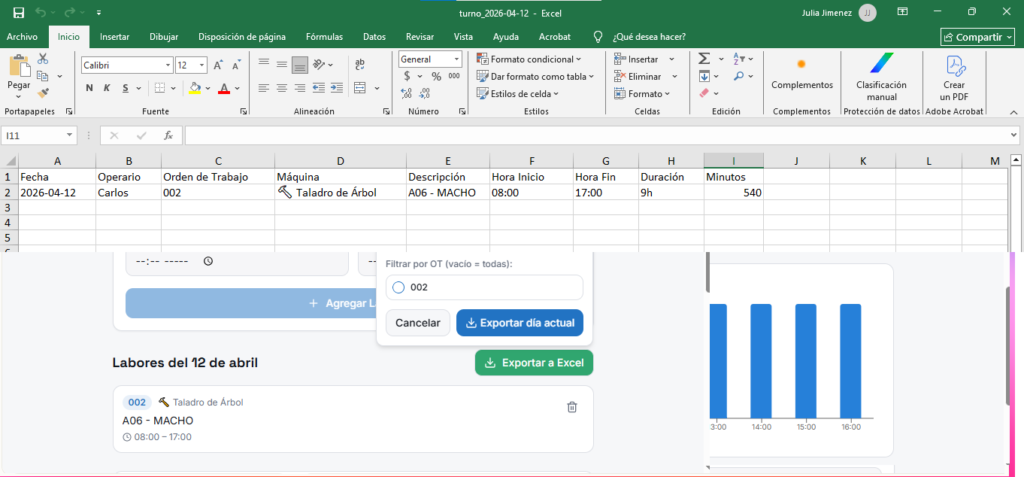 Se deben poder ver las labores realizadas en otros días y poder seleccionar los días para exportar a Excel, se deben poder seleccionar más de un día para poder exportar los días seleccionados a Excel, agrega una barra para agregar el nombre del operario que generara el registro de la labor realizada, agregar una lista desplegable de los nombres de los operarios a medida que se van agregando, con el fin de que sea más práctico y fácil ingresar nuevos días con las labores realizadas, adicionalmente es importante poder eliminar el nombre de un operario cuando esto necesario, agregar un campo donde se puedan seleccionar las ordenes trabajo y también poder exportar las seleccionadas a Excel.