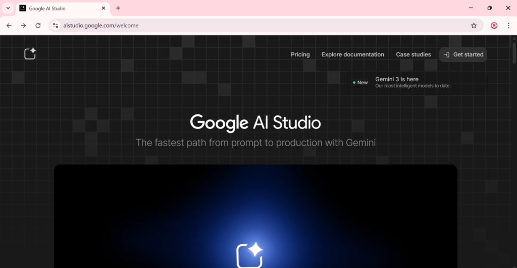 Busca Google AI Studio en tu navegador e ingresa al sitio oficial. Luego haz clic en “Get started” e inicia sesión con tu cuenta de Google o crea una nueva si es necesario.