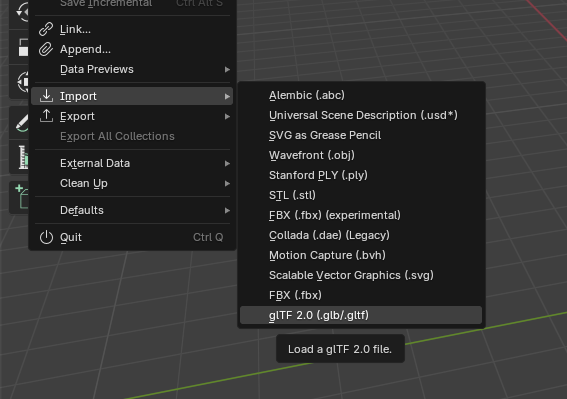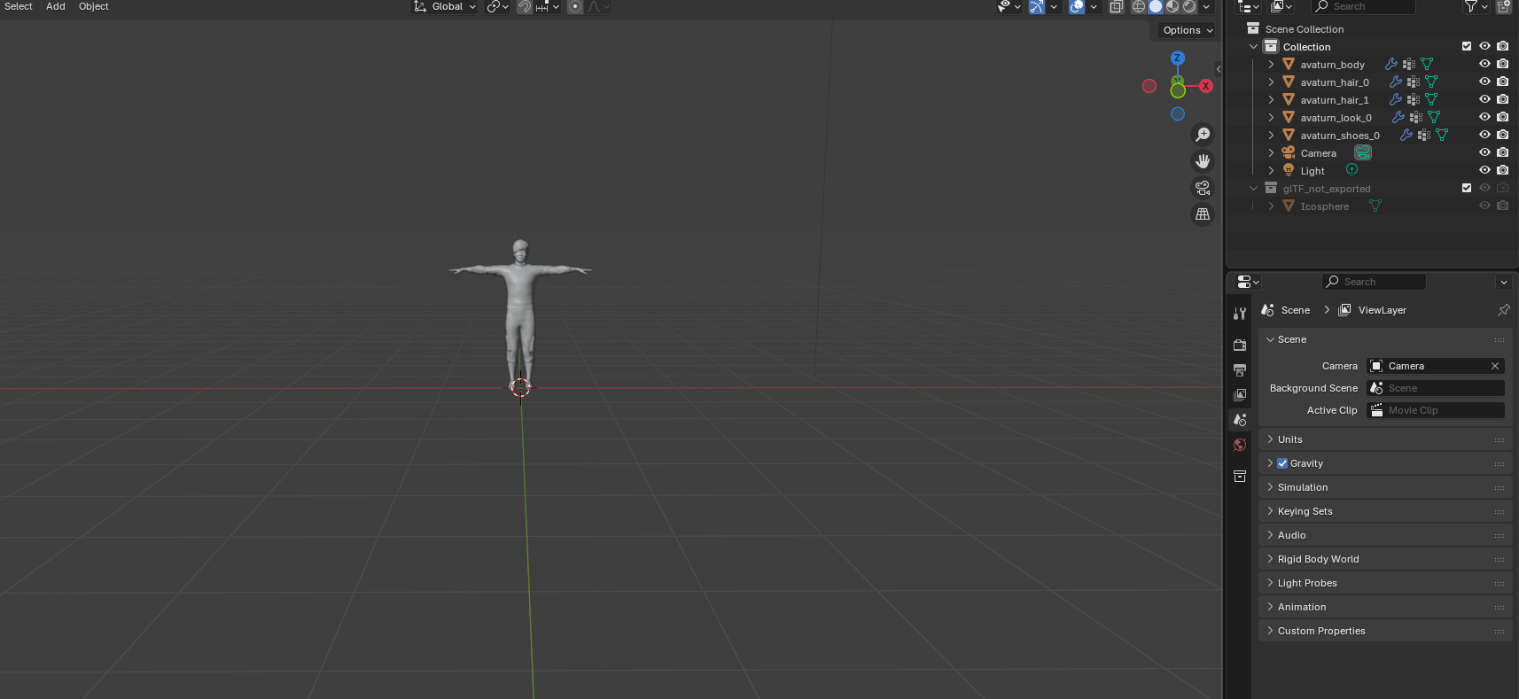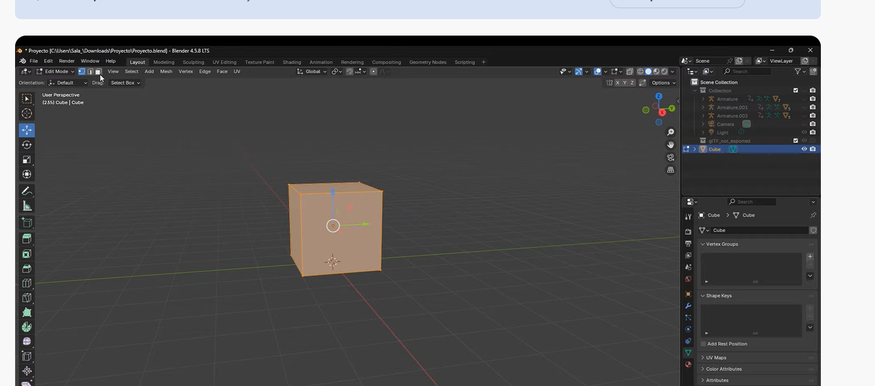 Dentro de Blender, primero se elimina el contenido de la escena por defecto. Después, se accede a la opción Archivo → Importar y se selecciona el archivo .glb del avatar descargado desde Avaturn.