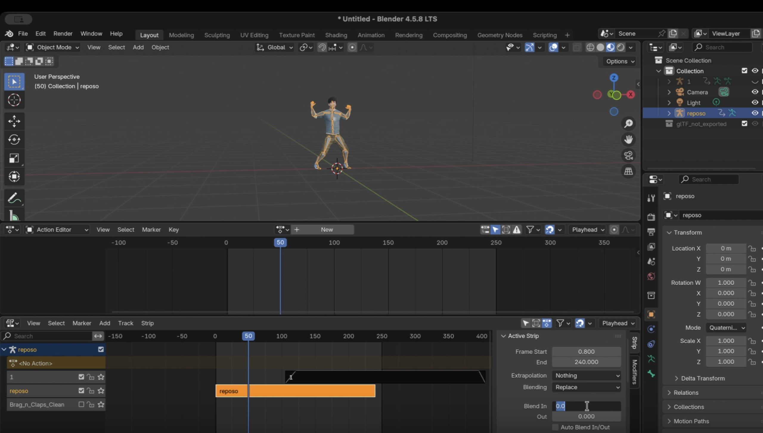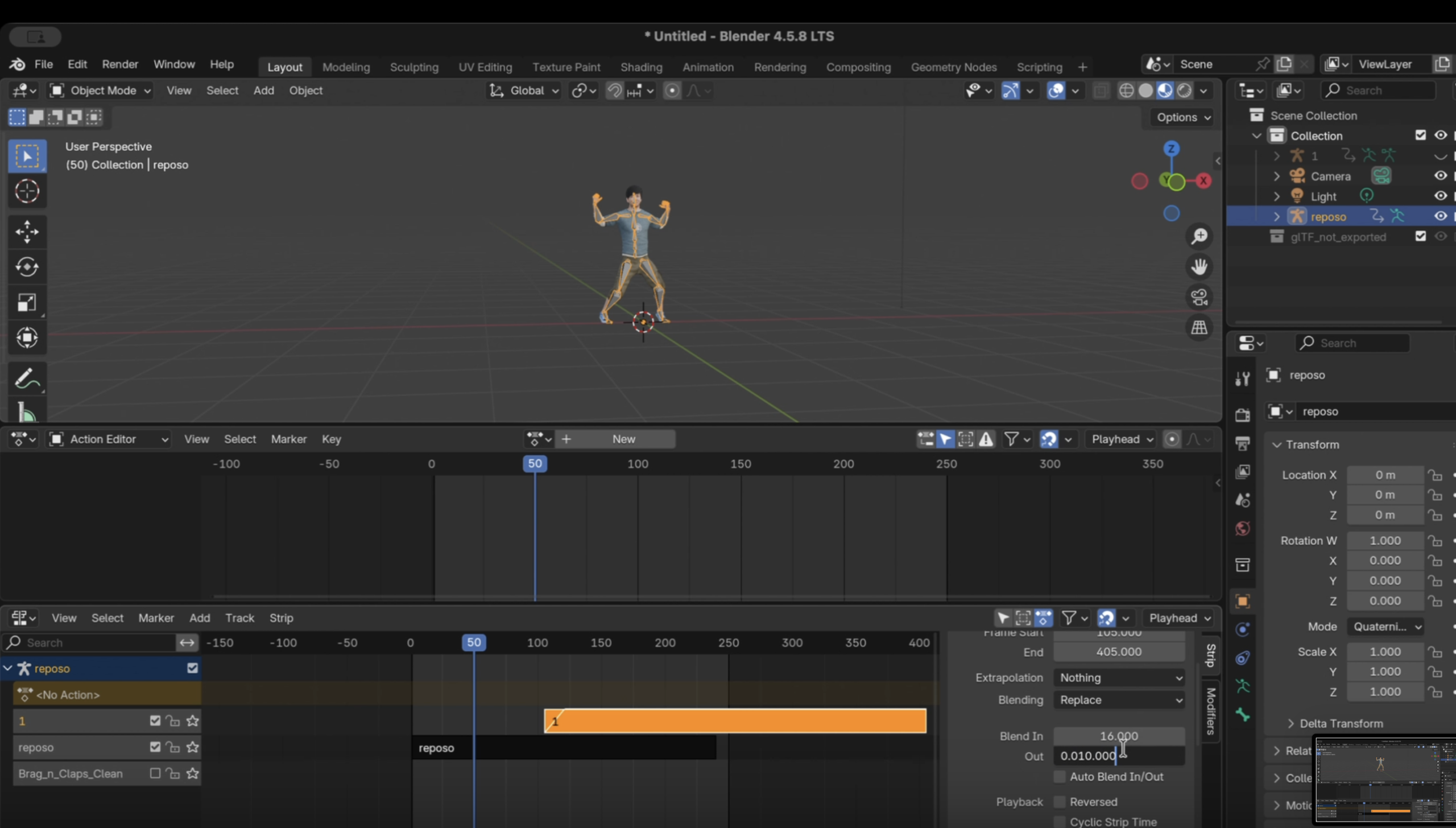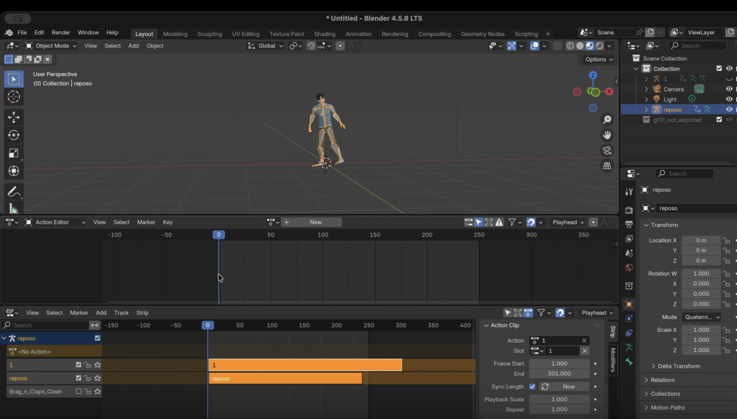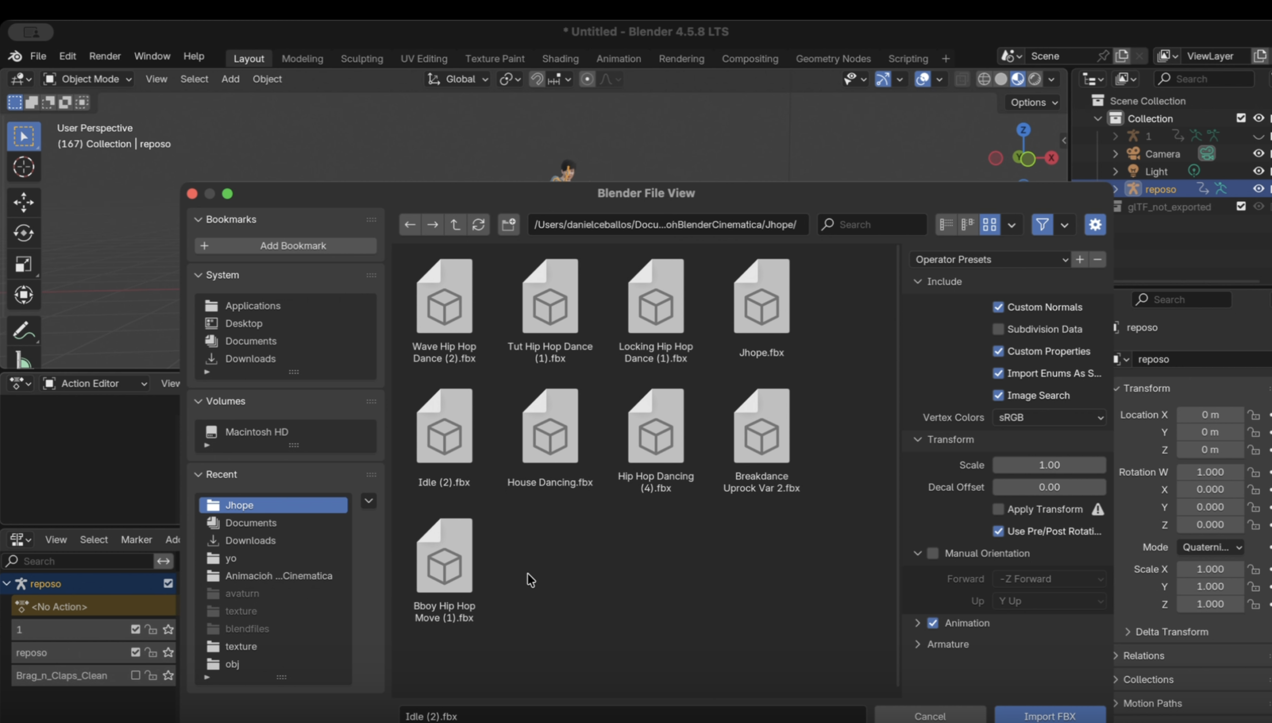 Con las animaciones descargadas, se importan a Blender una por una mediante Archivo → Importar → FBX. Es importante que al importar se active la opción de importar animación para que los datos de movimiento queden disponibles.