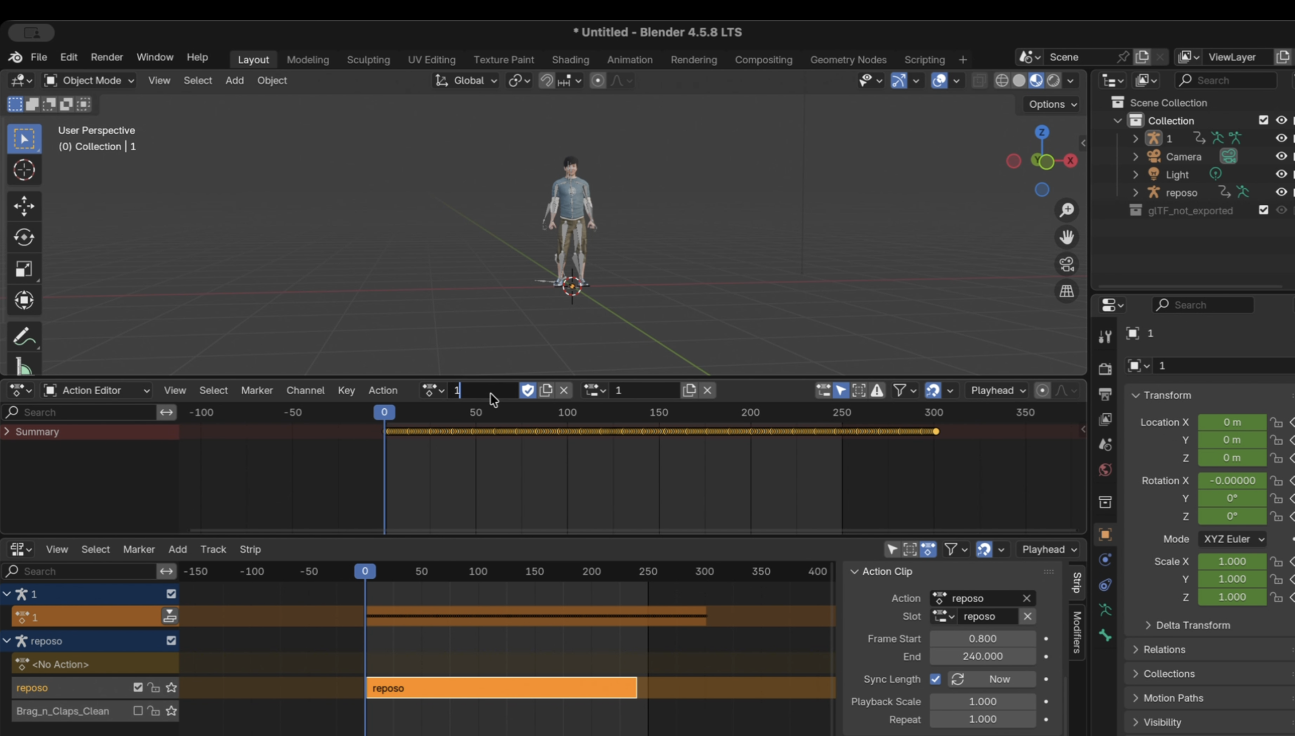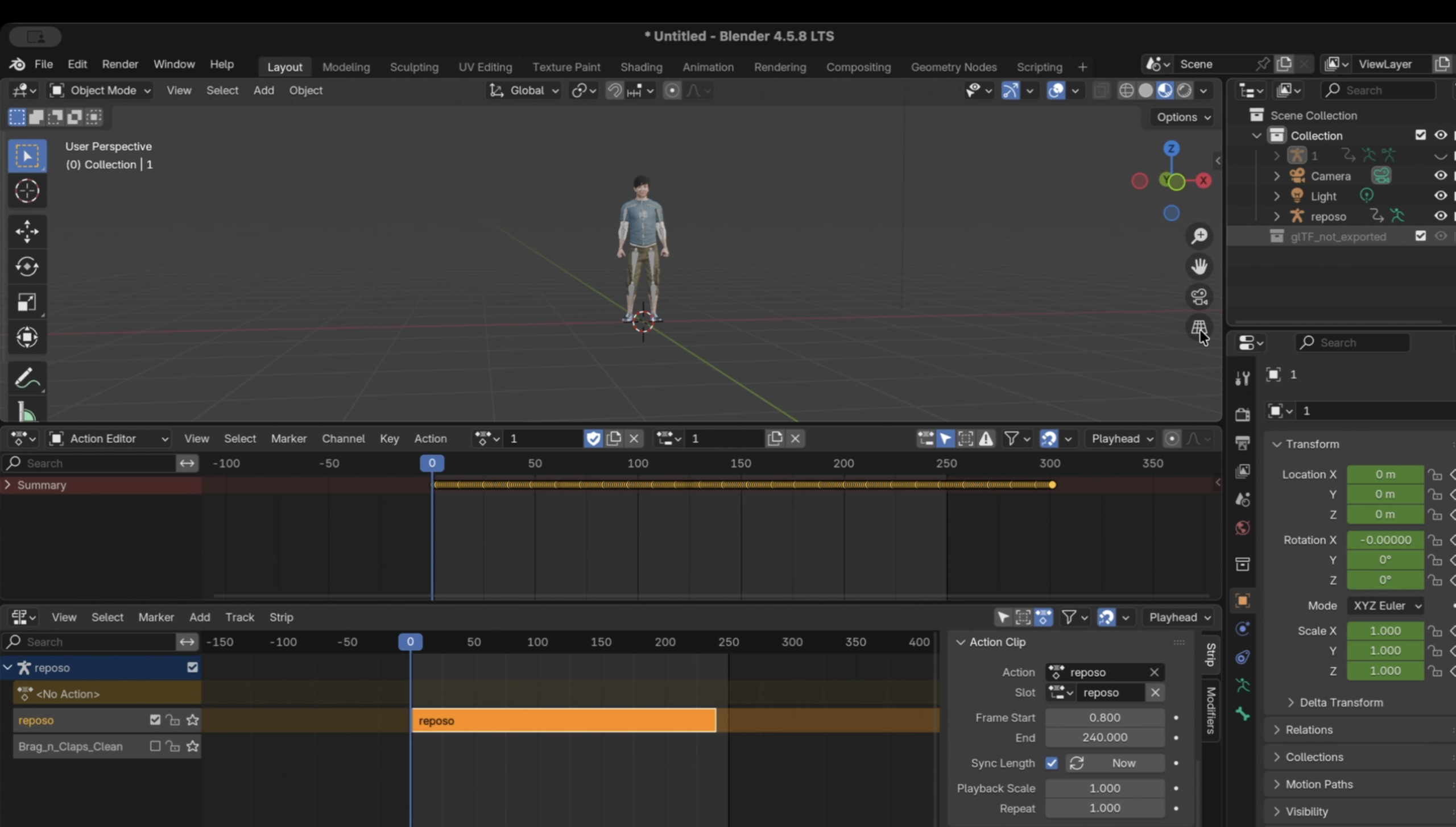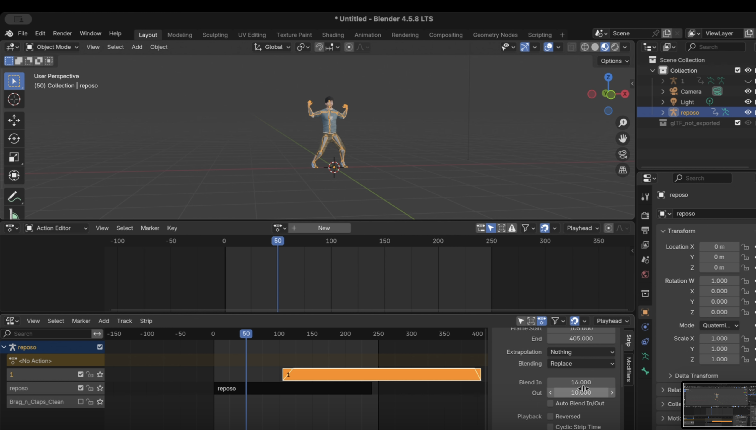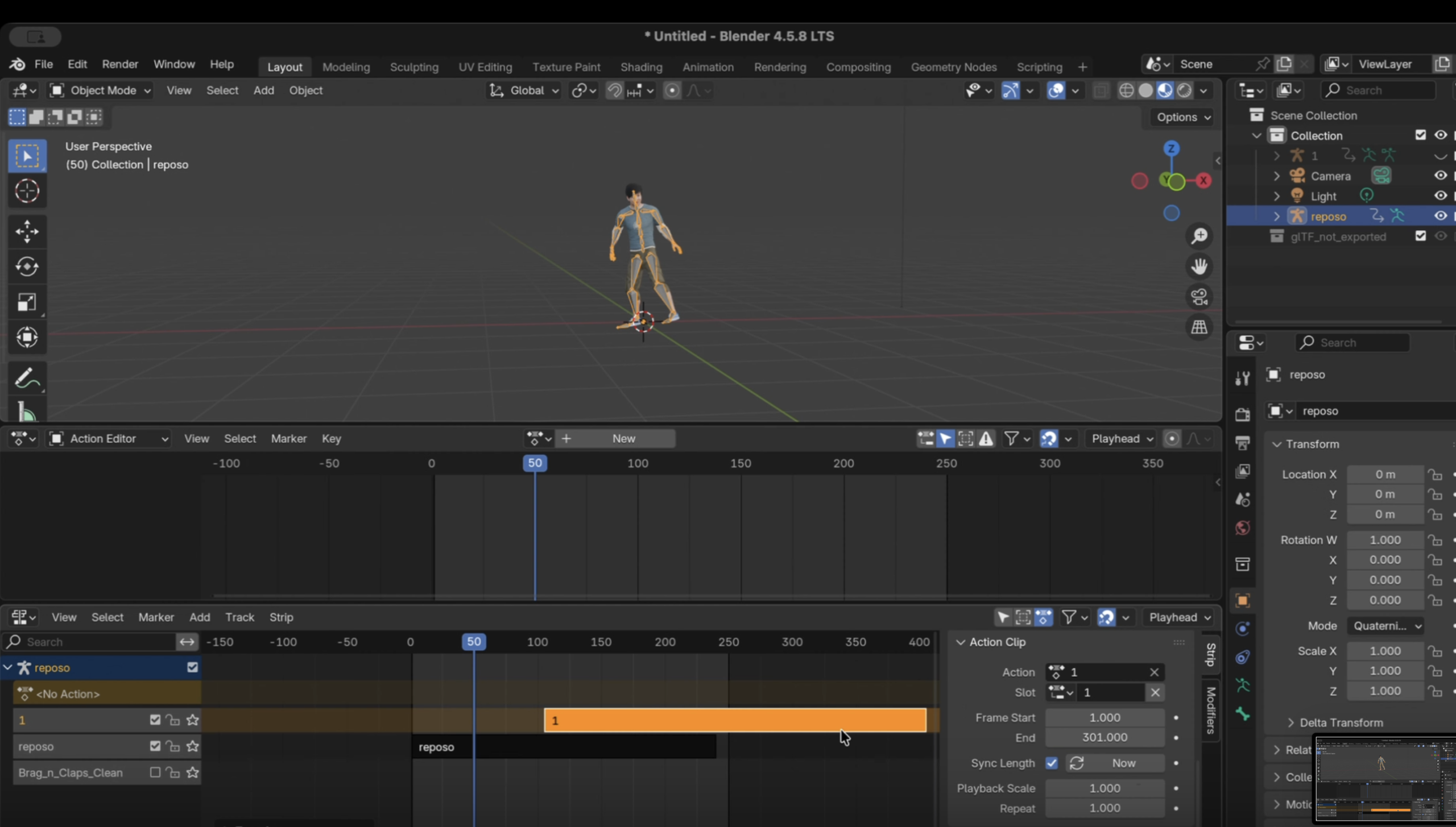 Con las animaciones descargadas, se importan a Blender una por una mediante Archivo → Importar → FBX. Es importante que al importar se active la opción de importar animación para que los datos de movimiento queden disponibles.