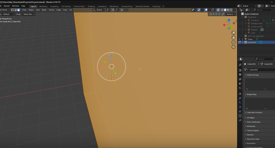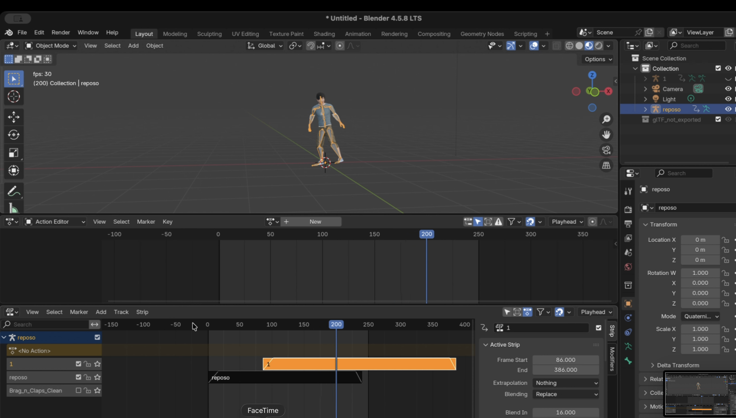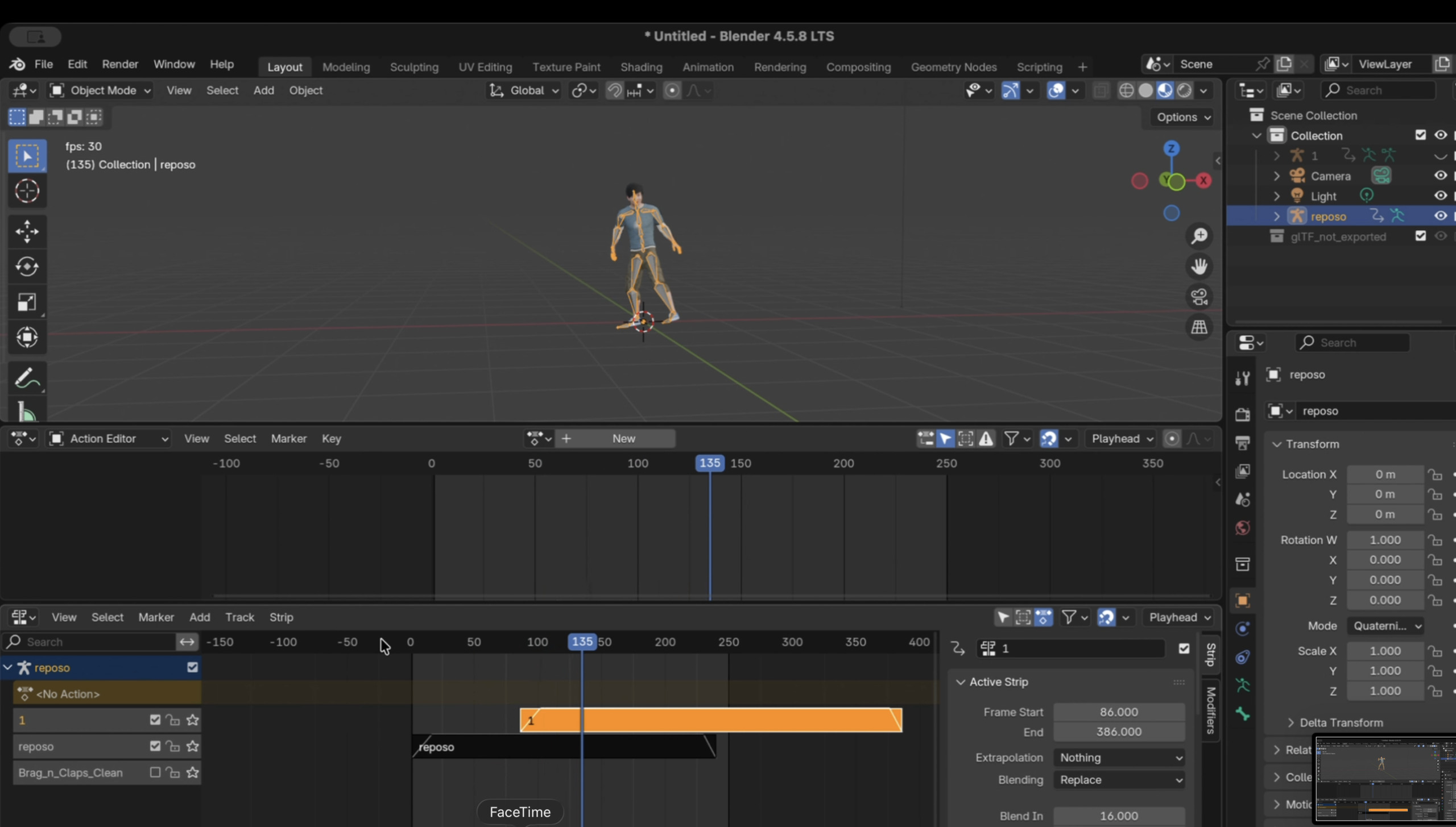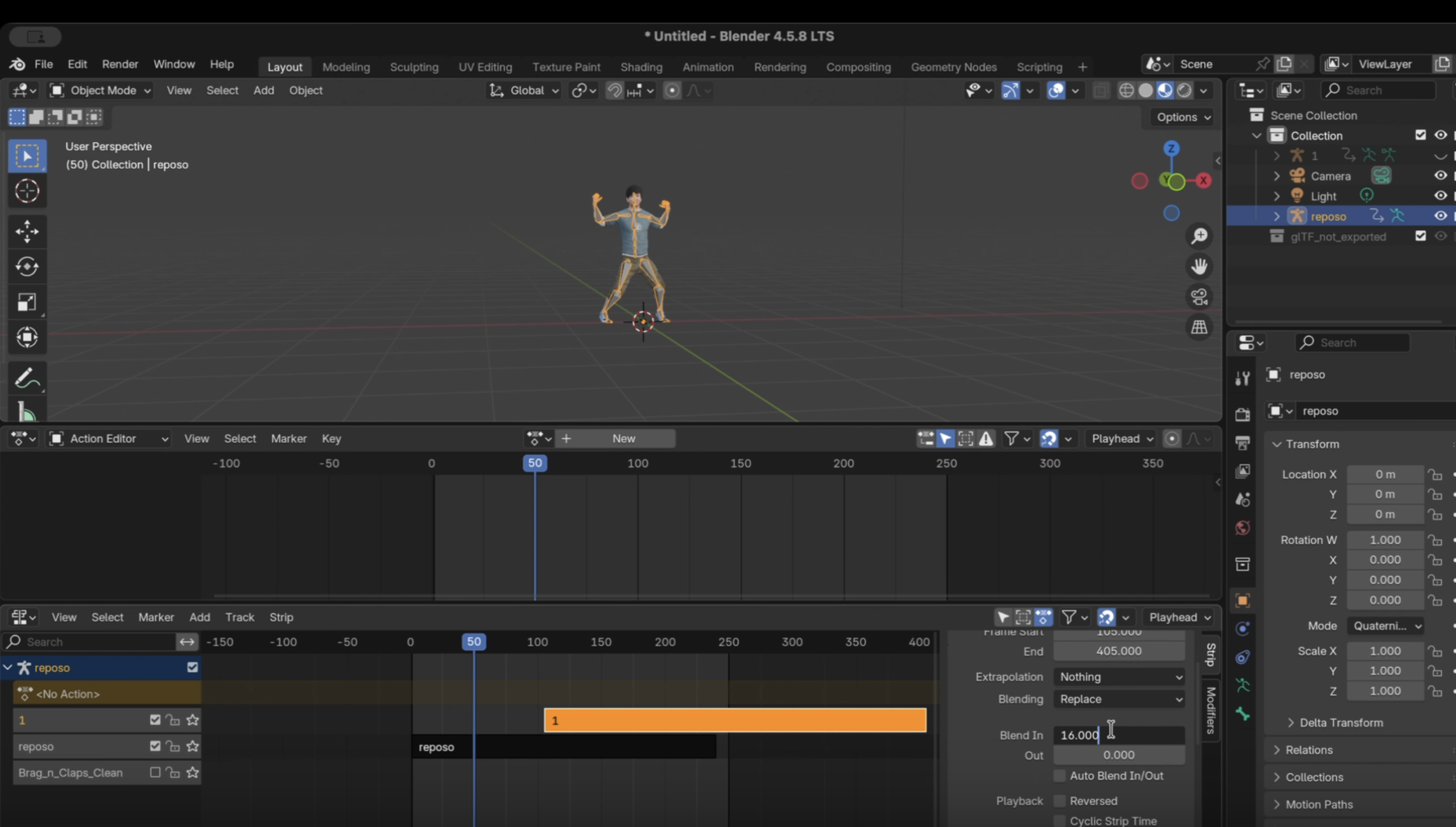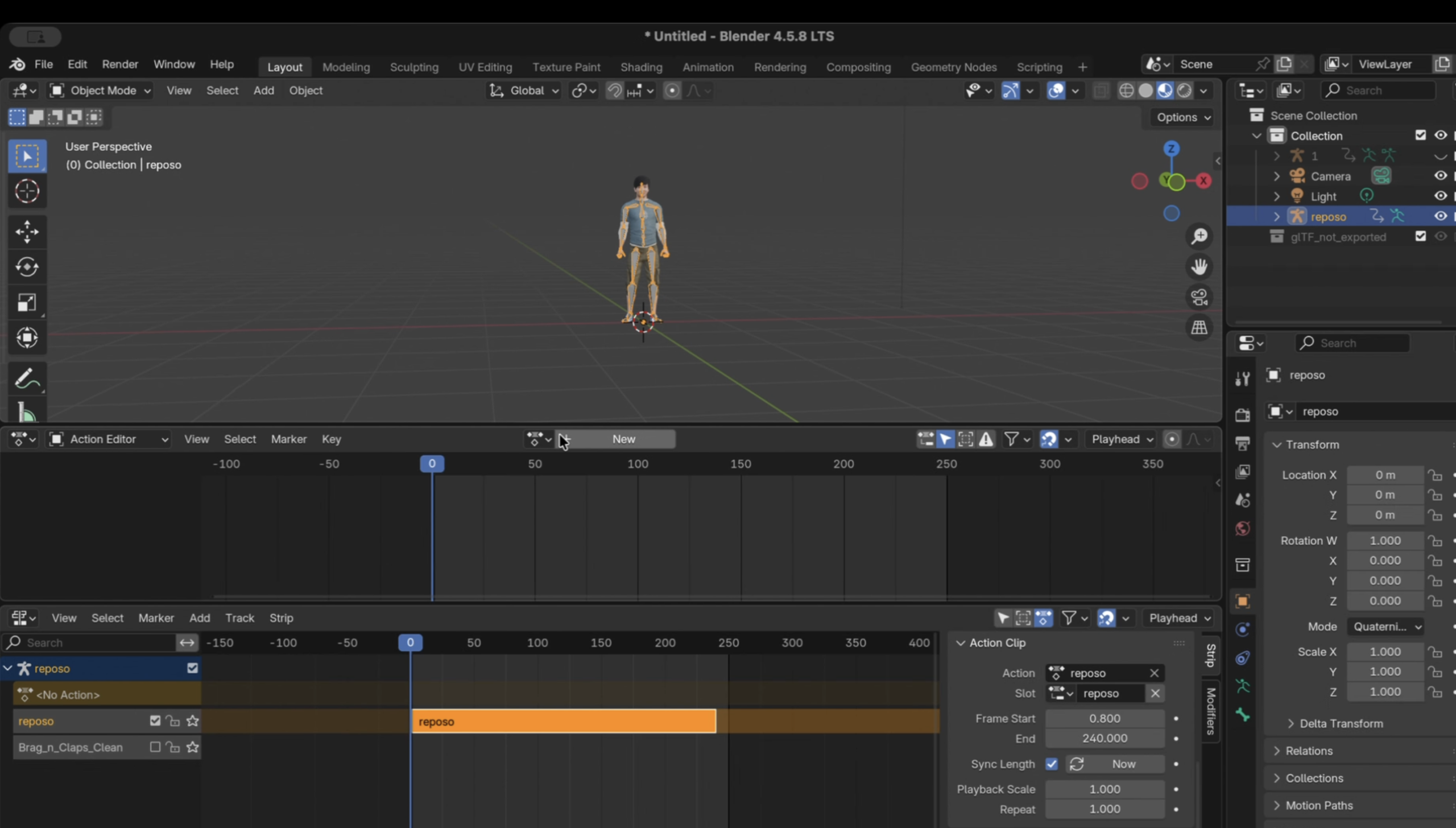 Con las animaciones descargadas, se importan a Blender una por una mediante Archivo → Importar → FBX. Es importante que al importar se active la opción de importar animación para que los datos de movimiento queden disponibles.