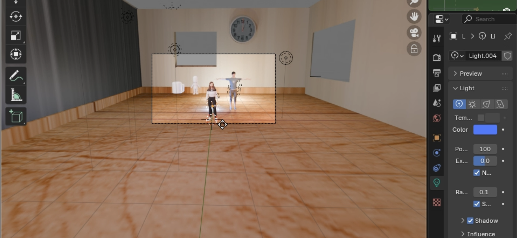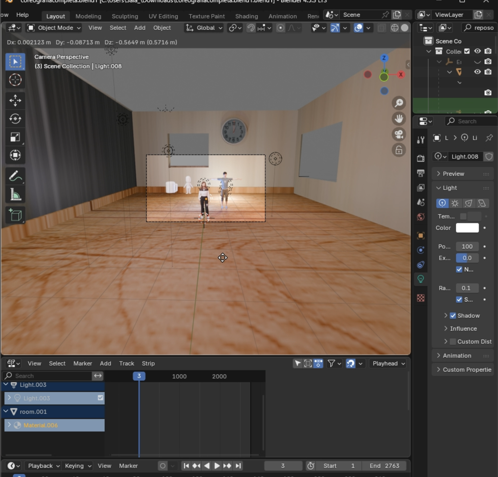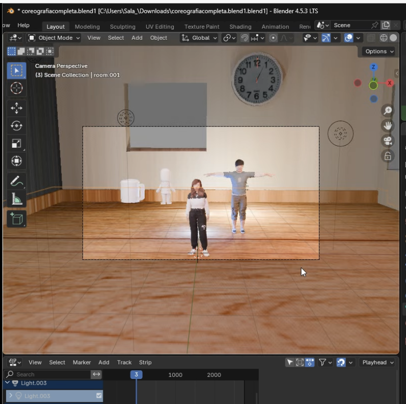 El escenario de la cinemática se modela completamente desde cero en Blender. Se construye una habitación tipo estudio de baile: paredes, suelo de madera y techo. Cada elemento se crea usando herramientas básicas de modelado como extrusión, escalado y edición de malla.