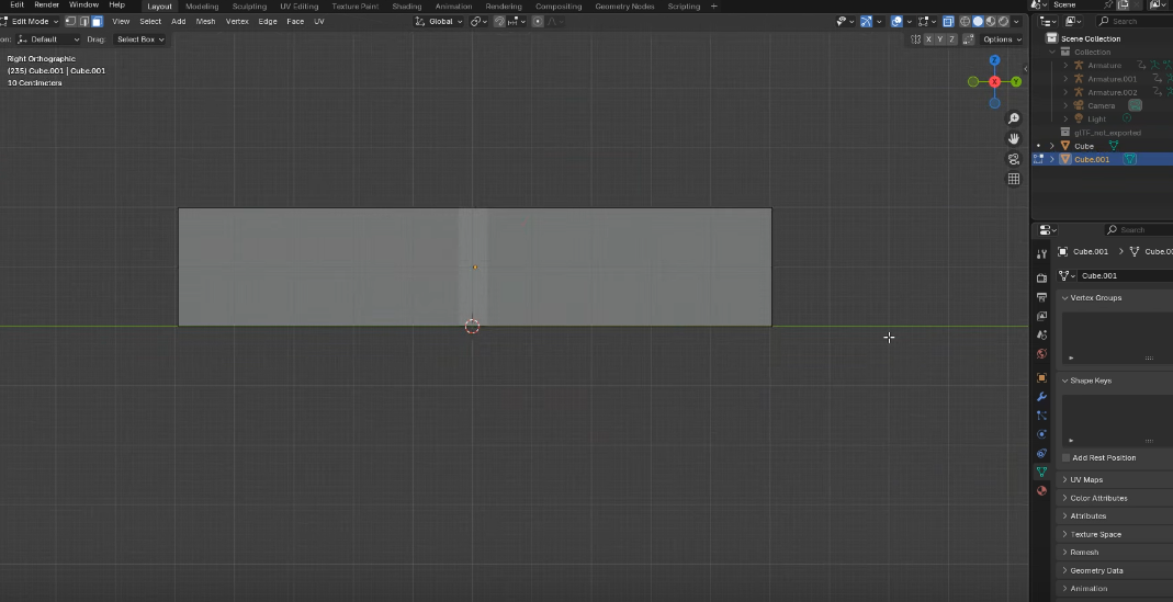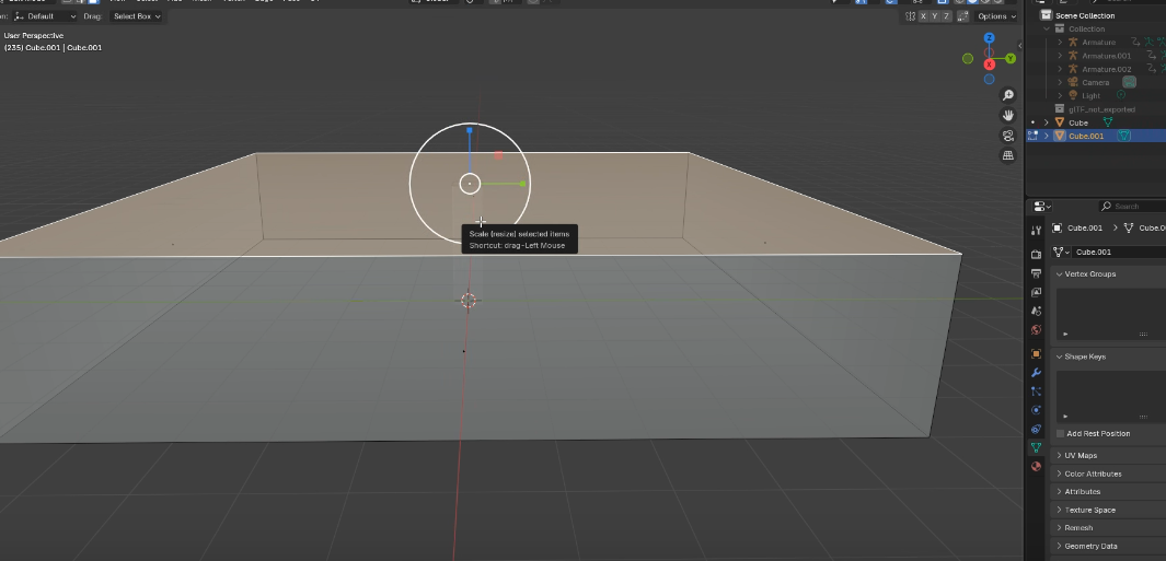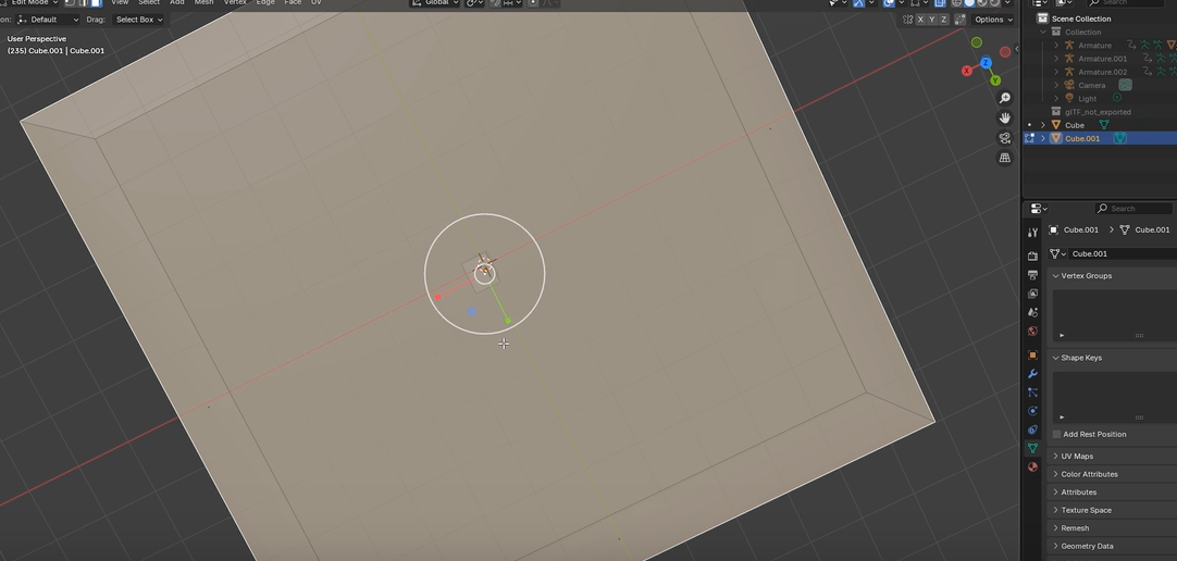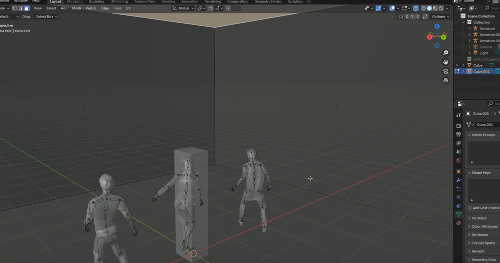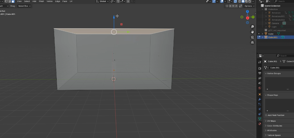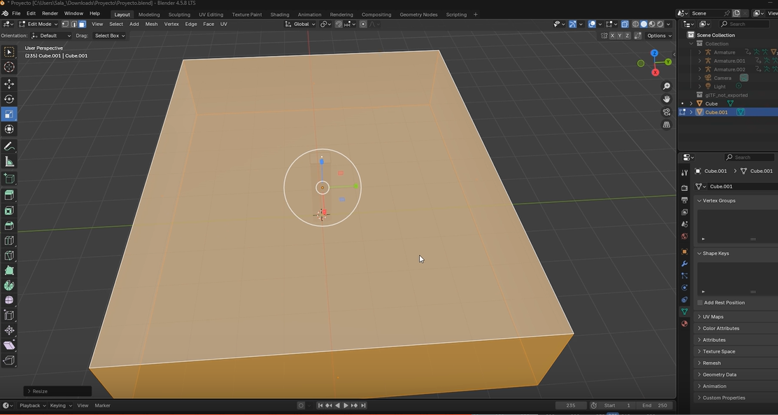 El escenario de la cinemática se modela completamente desde cero en Blender. Se construye una habitación tipo estudio de baile: paredes, suelo de madera y techo. Cada elemento se crea usando herramientas básicas de modelado como extrusión, escalado y edición de malla.