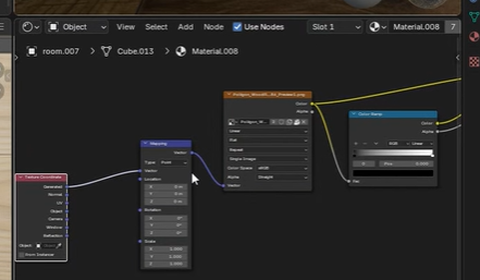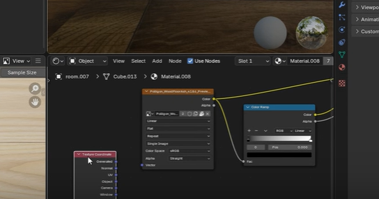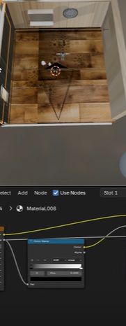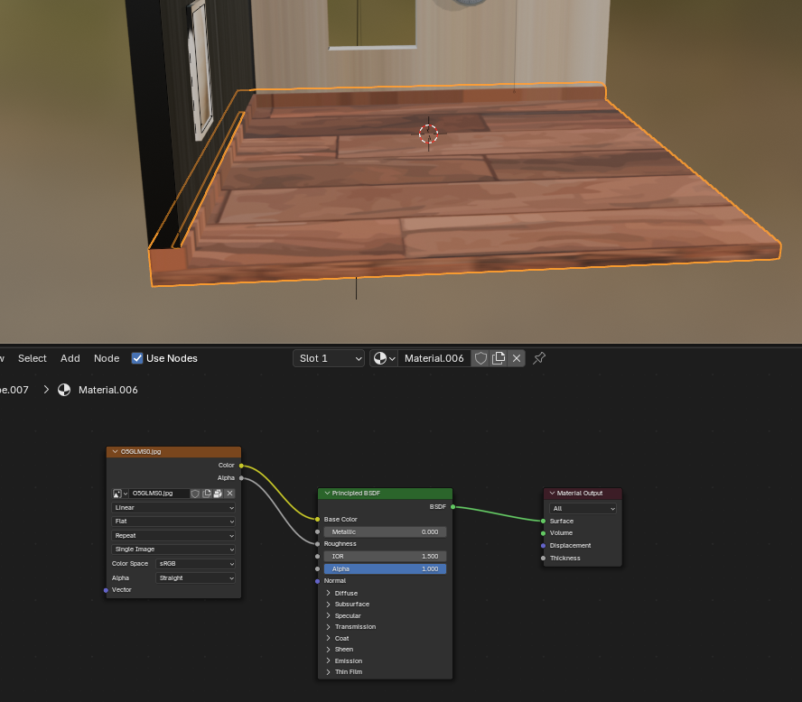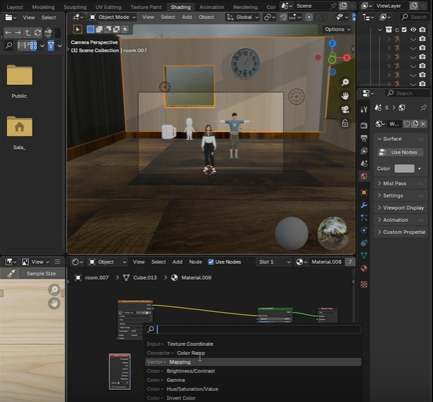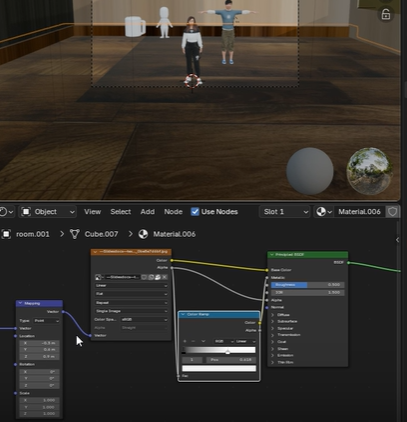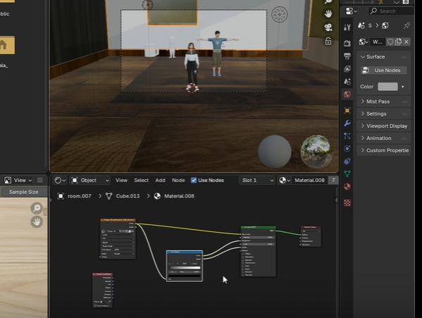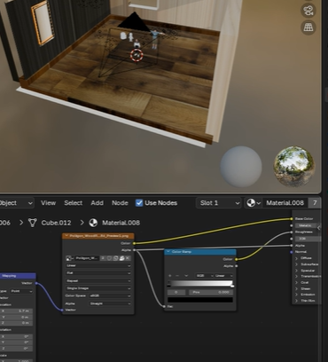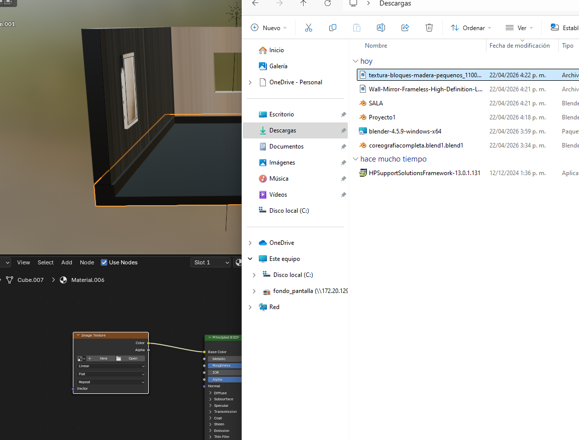Una vez modelados los objetos, se procede al texturizado. Las texturas se obtienen de Google Imágenes: se buscan texturas de madera para el suelo, pintura para las paredes y otros materiales según la escena. Estas imágenes se importan en Blender como materiales con nodos.Editor de shaders — aplicación de textura de madera al suelo mediante nodos
