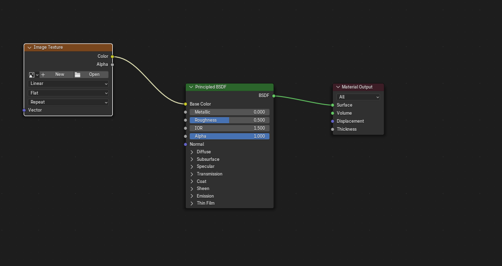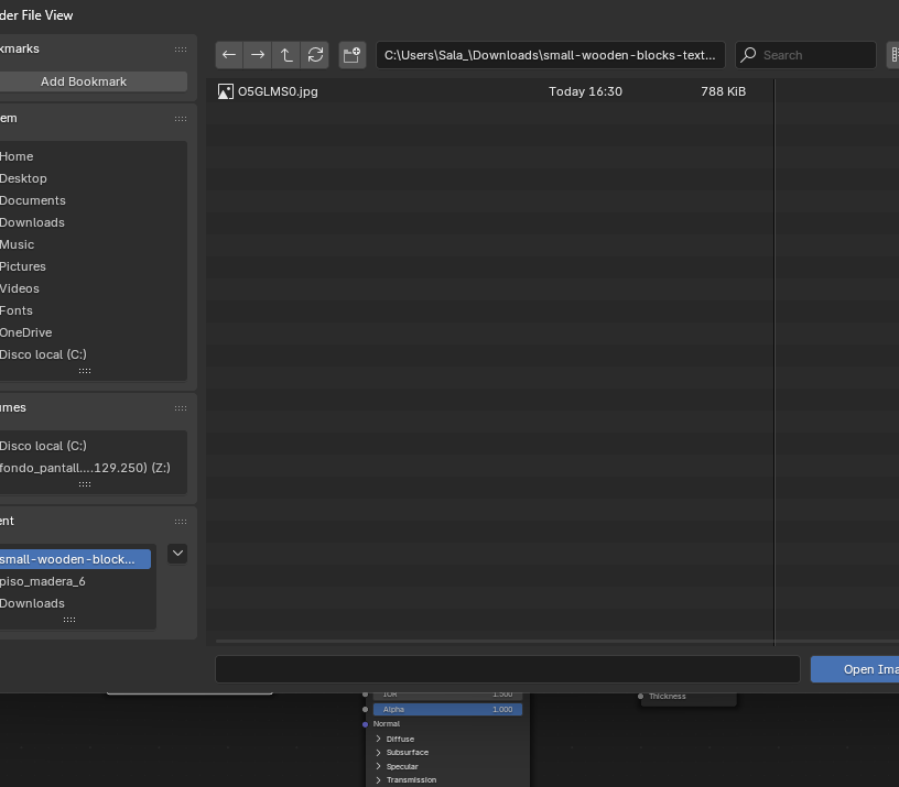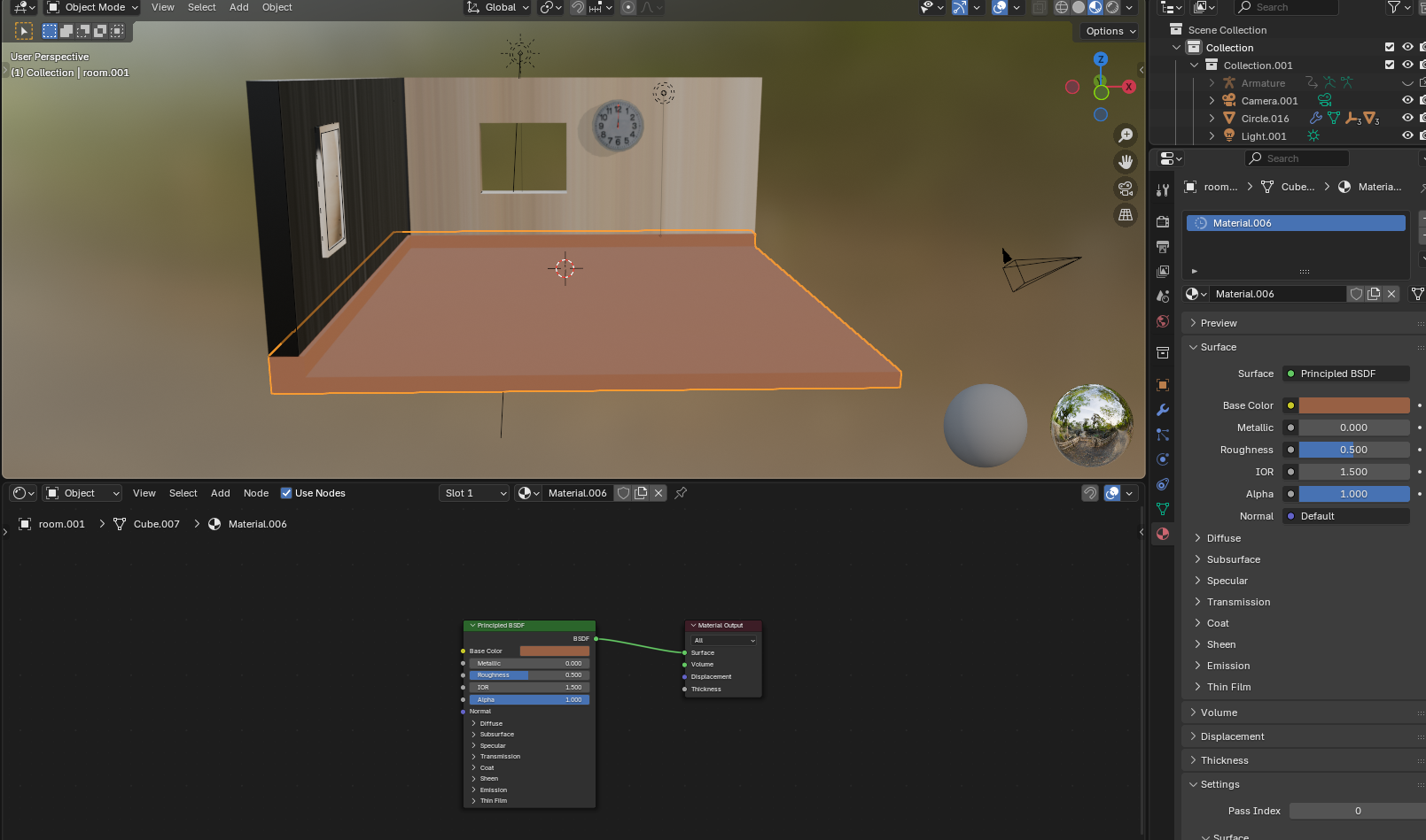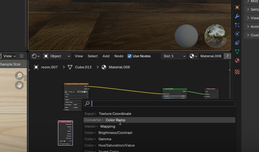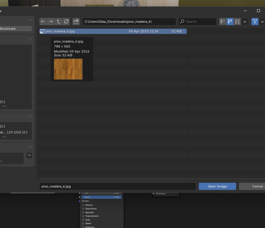 Una vez modelados los objetos, se procede al texturizado. Las texturas se obtienen de Google Imágenes: se buscan texturas de madera para el suelo, pintura para las paredes y otros materiales según la escena. Estas imágenes se importan en Blender como materiales con nodos.Editor de shaders — aplicación de textura de madera al suelo mediante nodos