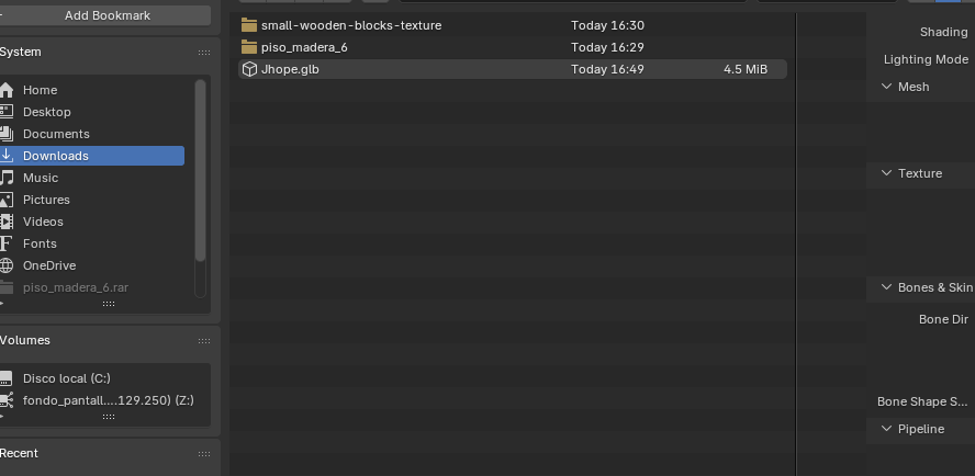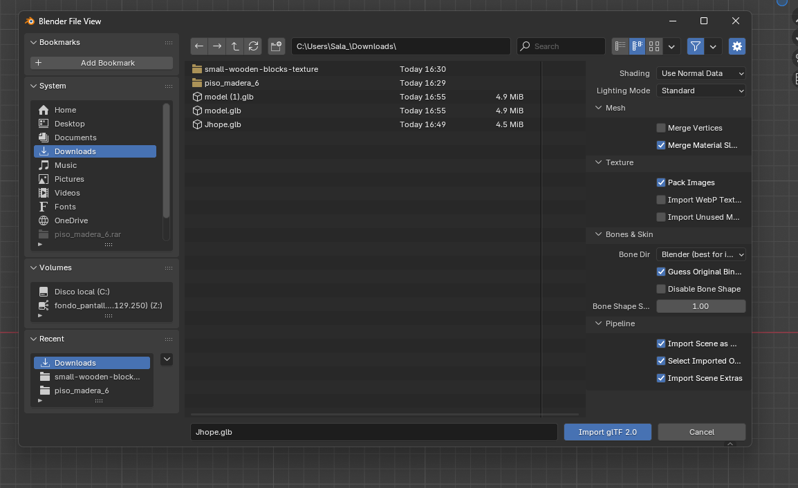 Visor de archivos de Blender — selección del archivo .glb del personaje