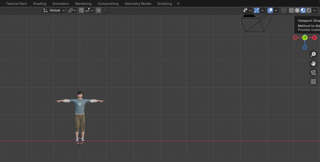 Para visualizar correctamente el modelo, se activa la opción de previsualización de materiales desde la barra superior. También se puede ocultar la armadura temporalmente para una mejor visualización del personaje.