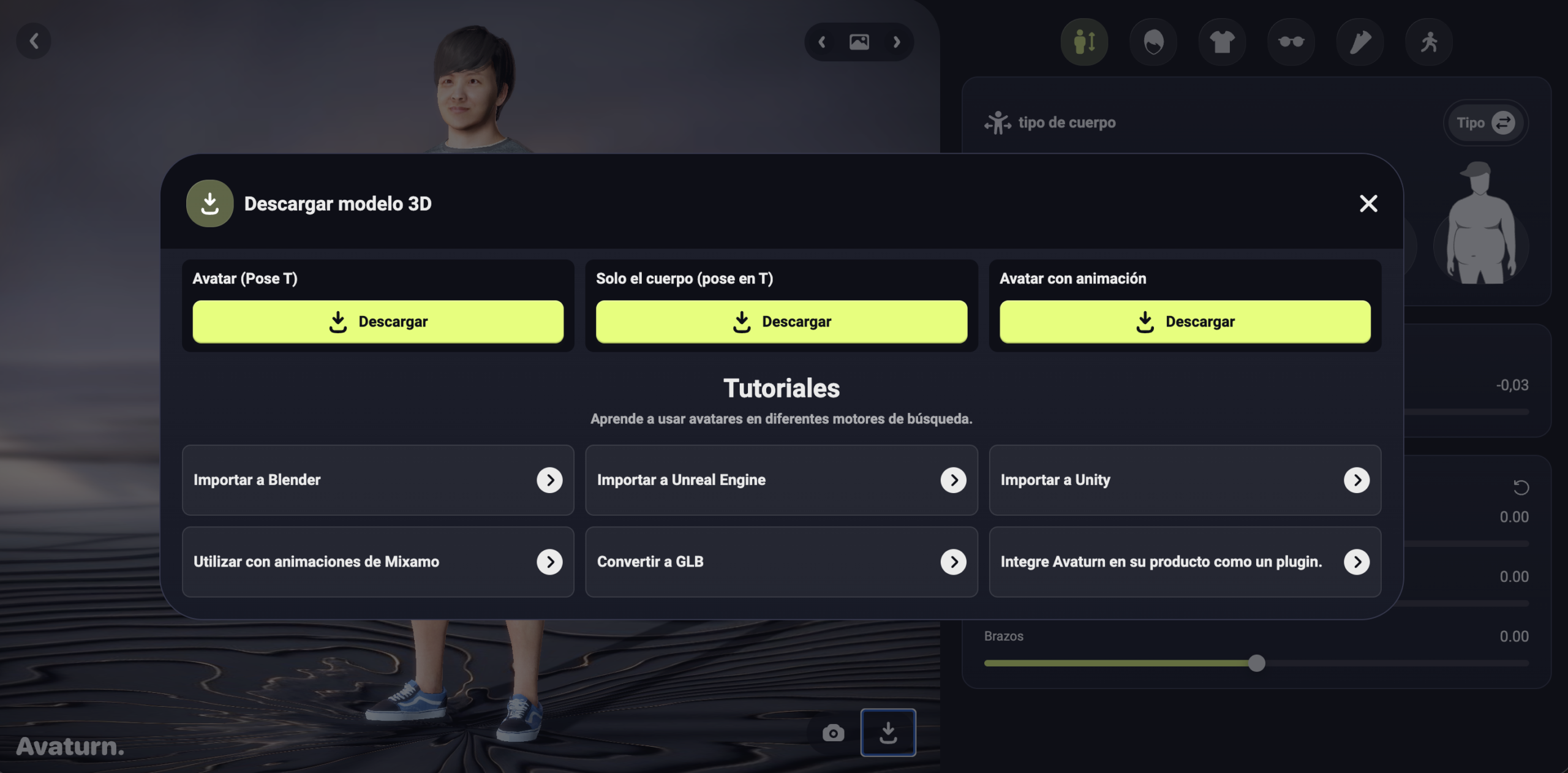 Una vez finalizada la personalización, se procede a descargar el modelo. Se recomienda elegir la opción en pose T (T-Pose), ya que este formato facilita su uso en animaciones posteriores dentro de Blender.