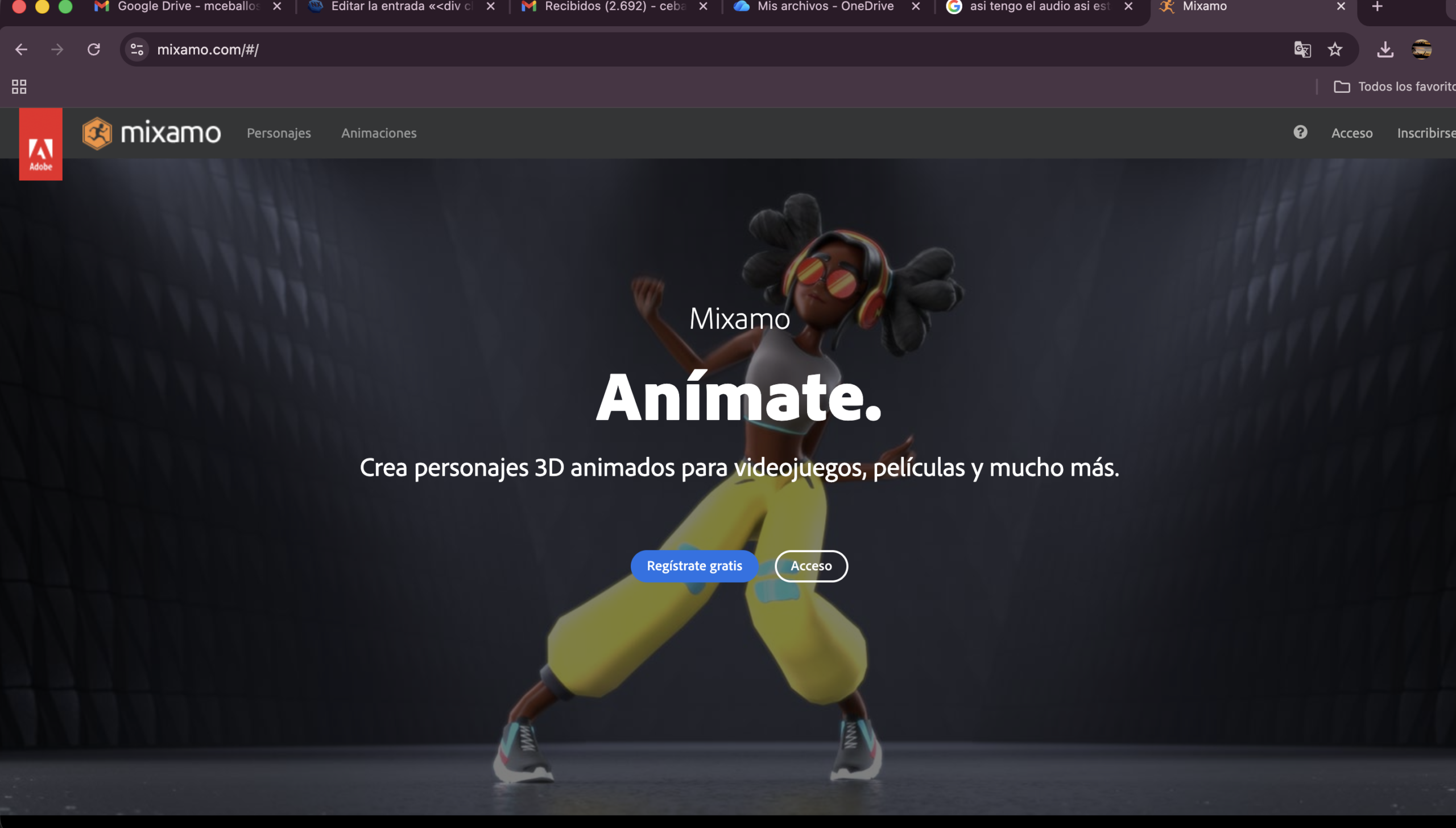 Para las animaciones del baile, se utiliza Mixamo, una plataforma gratuita de Adobe que ofrece cientos de animaciones de personajes. Se accede desde el navegador en mixamo.com y se inicia sesión con una cuenta de Adobe.