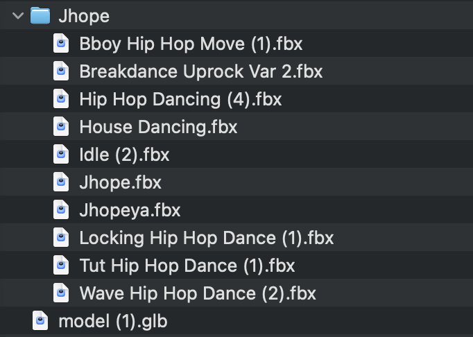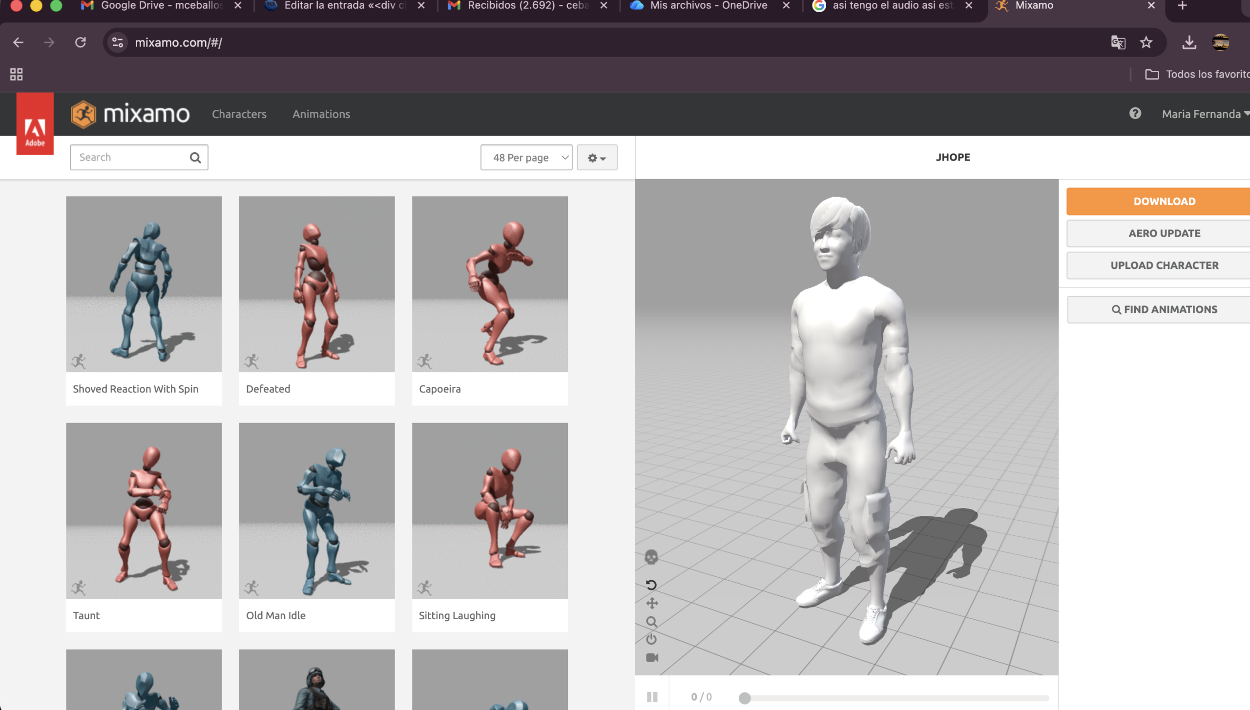 Primero se sube el modelo del personaje en formato .fbx para que Mixamo lo reconozca. Luego se selecciona cada animación que se desea usar para la coreografía de MIC Drop.