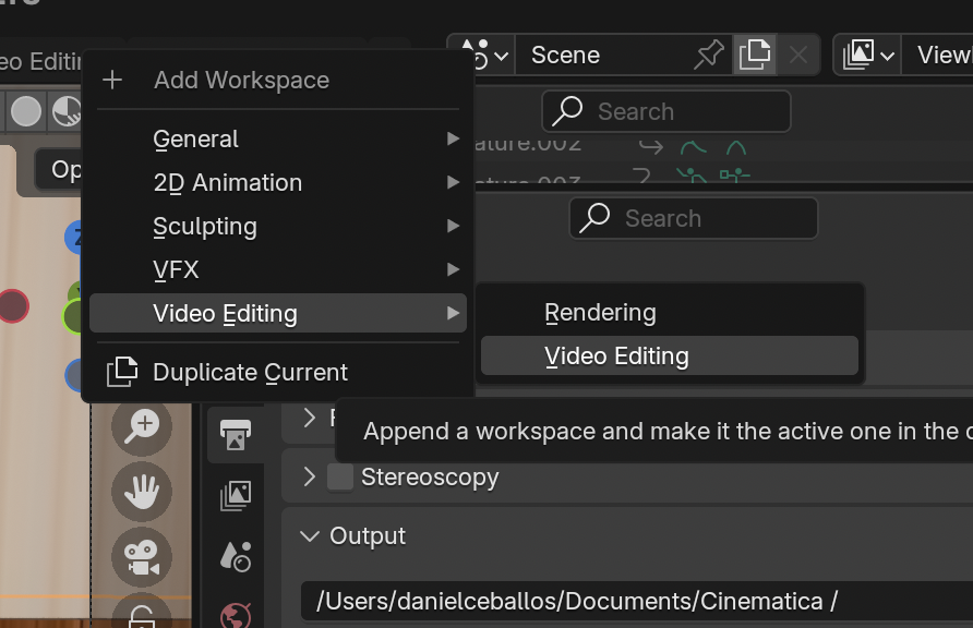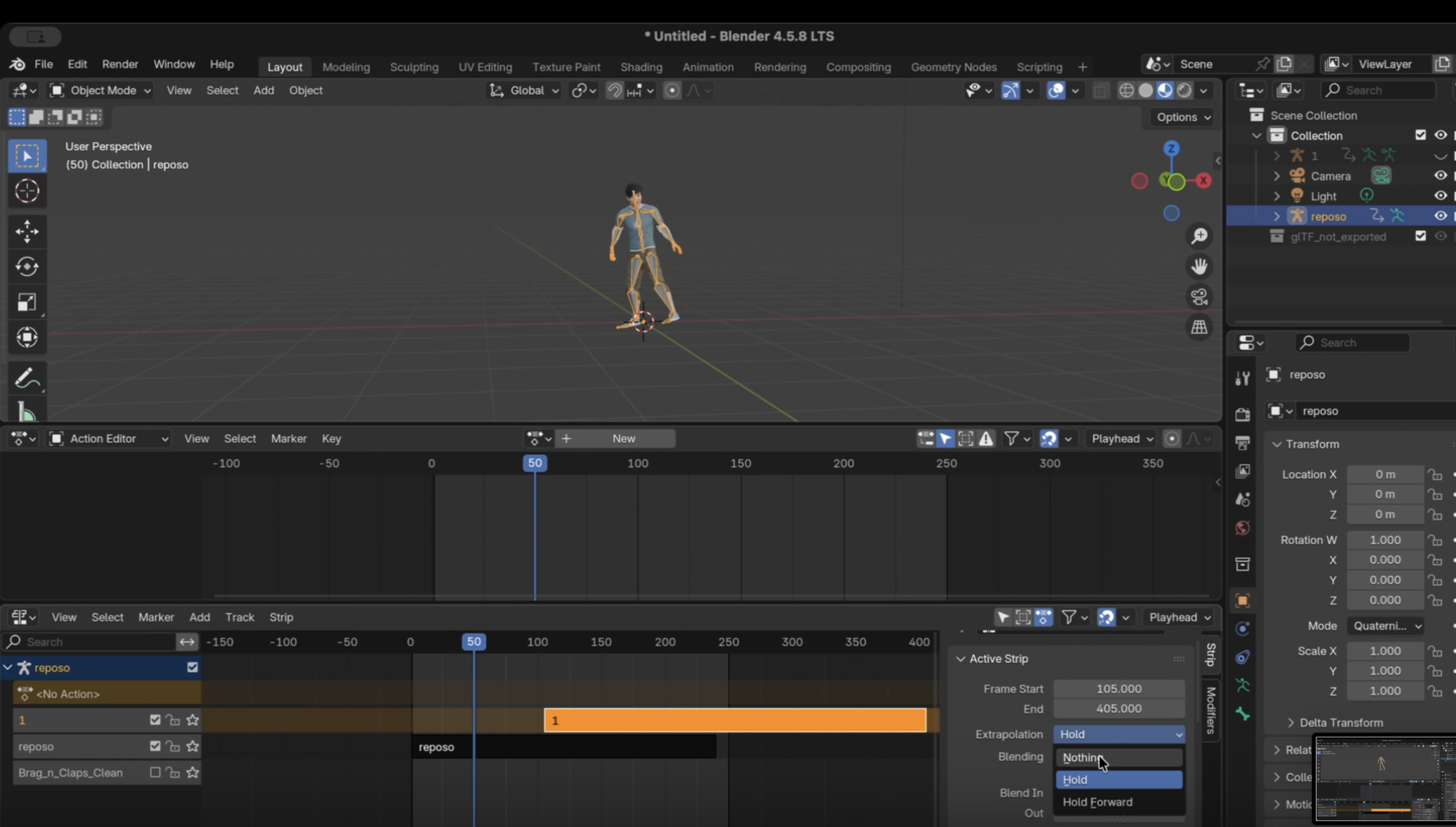 Una vez importadas todas las animaciones, se abre el Editor de Animación No Lineal (NLA Editor) desde el menú de editores de Blender. Este editor permite organizar, combinar y ajustar los distintos clips de animación en una línea de tiempo.
