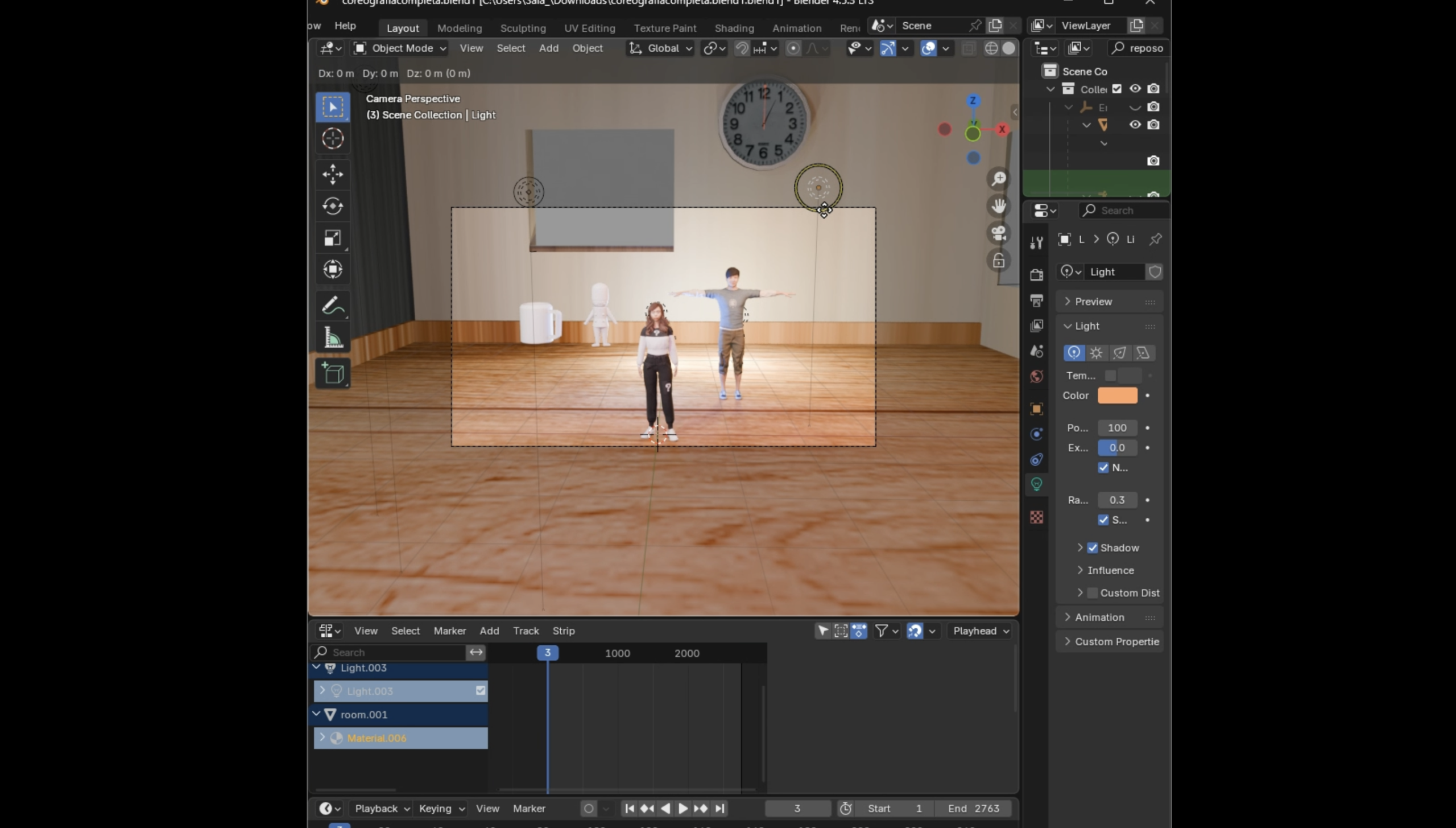 Después, se descargan las animaciones de baile desde Mixamo y se combinan en el editor de animación no lineal (NLA) de Blender para construir la secuencia completa. Finalmente, se configura la iluminación de la escena y se realiza el render del proyecto.