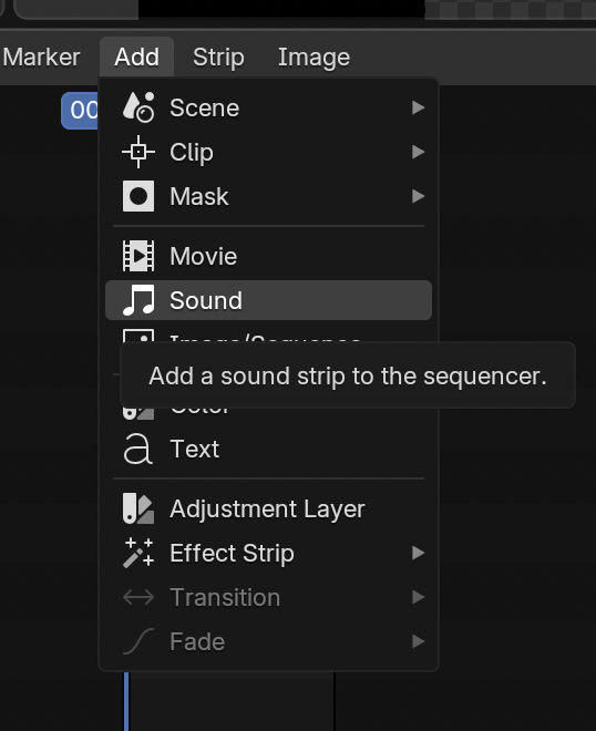 Video Sequence Editor — menú Shift + A para agregar el archivo de sonido.