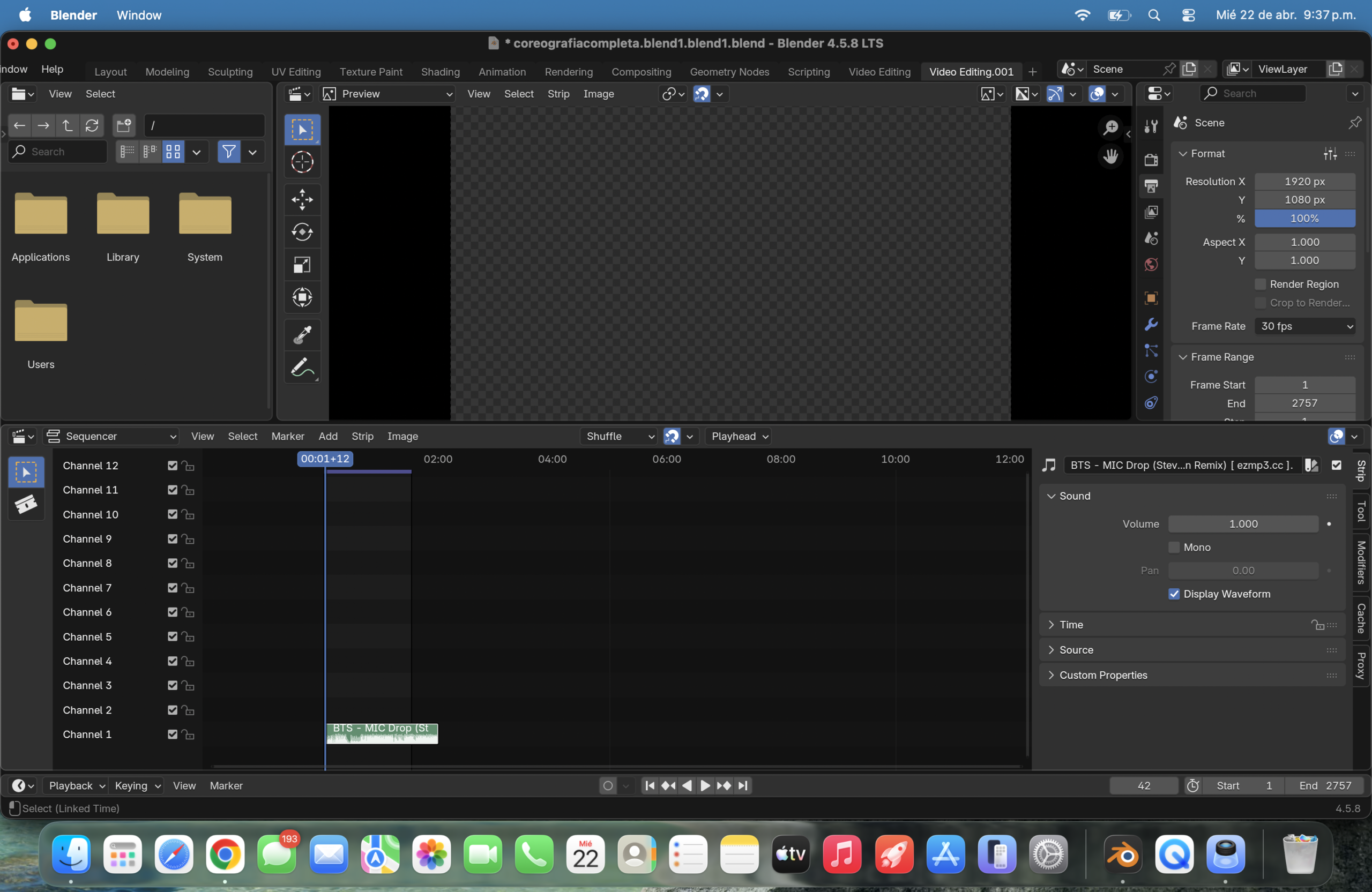 Video Sequence Editor con la pista de audio de MIC Drop visible y posicionada.