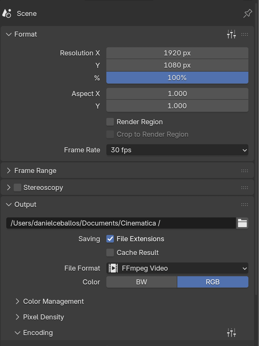 Propiedades de Render — resolución, FPS y rango de frames configurados