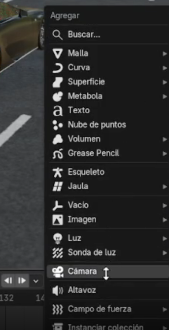Ya teniendo la animación de las ruedas vamos a jugar con las cámaras, para poner una usaremos Shift + A y buscamos la opción de cámara